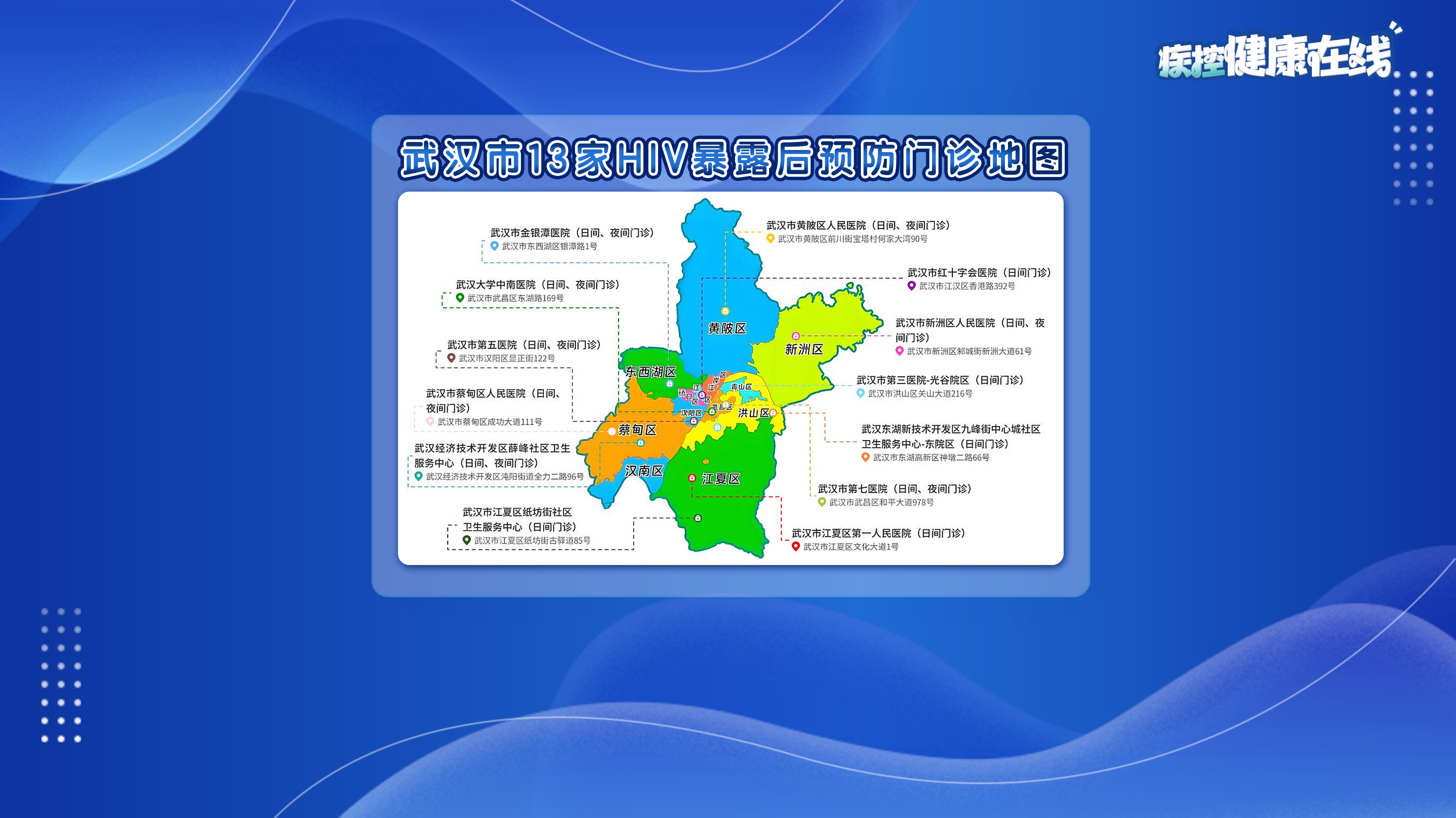 武汉PEP服务体系:根据《中国遏制与防治艾滋病规划(2024—2030年)》要求,武汉市疾控中心着力推进医防协同、医防融合,建成13家HIV暴露后预防门诊(10家综合医院+3家社区卫生服务中心),覆盖全市11个区,形成“2小时PEP阻断服务圈”。