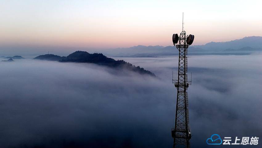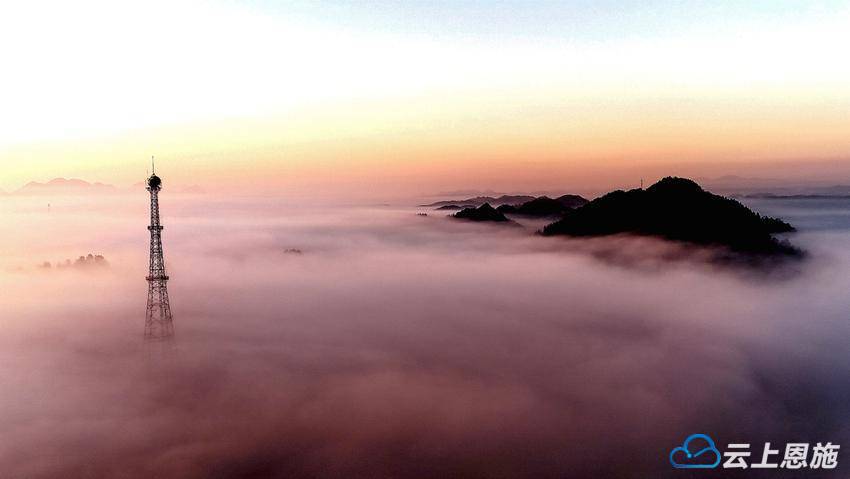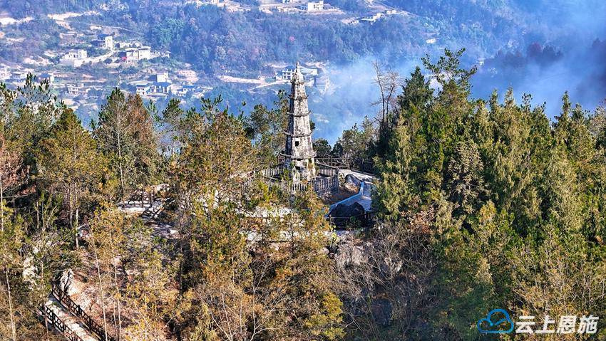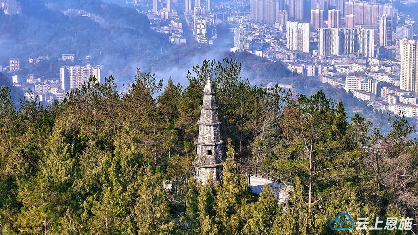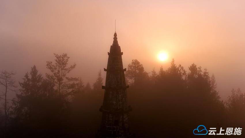 近日,在湖北恩施建始县业州镇金建社区,晨雾与朝阳交融,漫过山峦。百年历史的建阳宝塔与现代信号塔在云海中遥相对望,构成传统与现代交织的初冬景象。