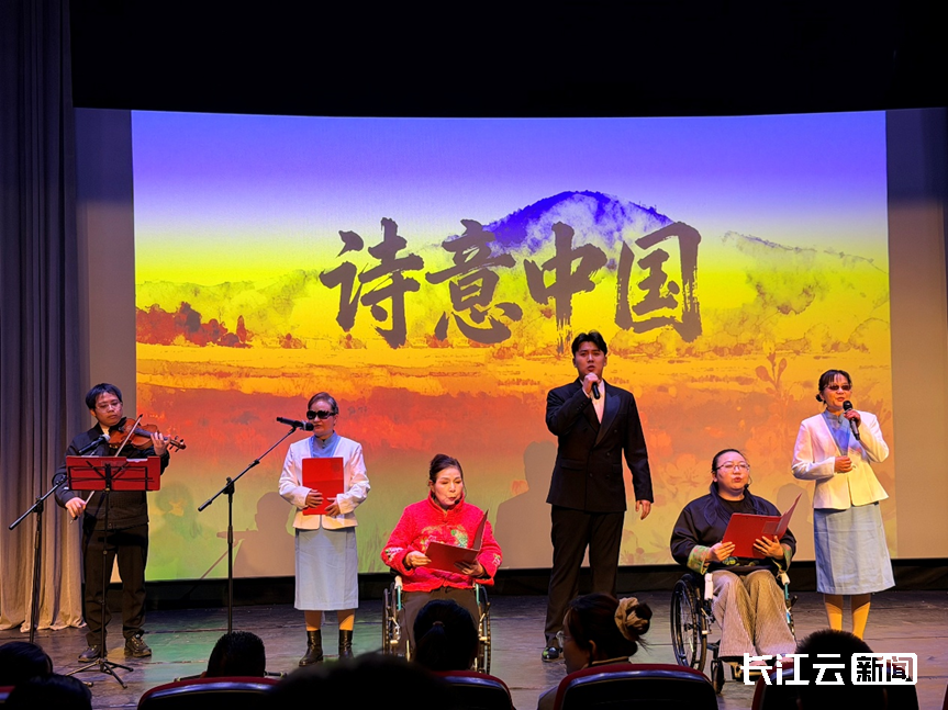 朗诵爱好者代表戴清兰、高茜、张慧清、姚倩等共同演绎的诗文朗诵《诗意中国》,第十一届全国残疾人艺术汇演独唱类一等奖获得者汪罗安独唱《我爱你中国》,用声音传递出心灵感知的诗意,深深打动了在场观众。