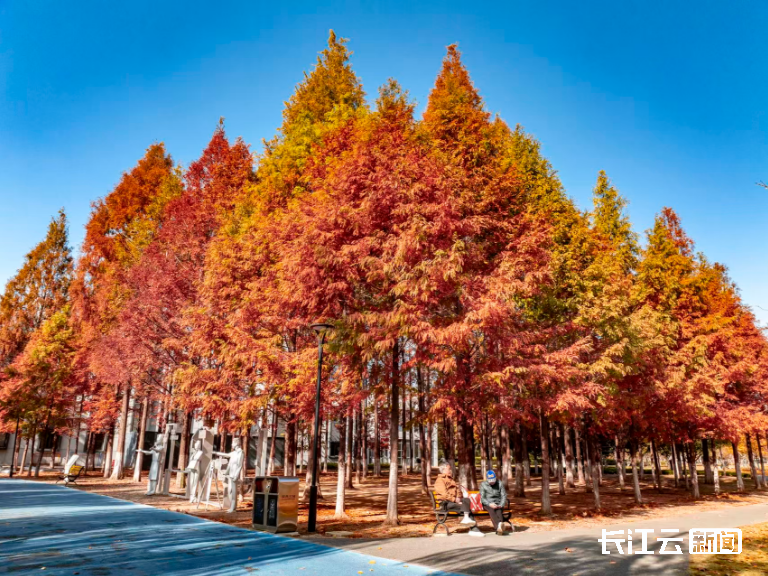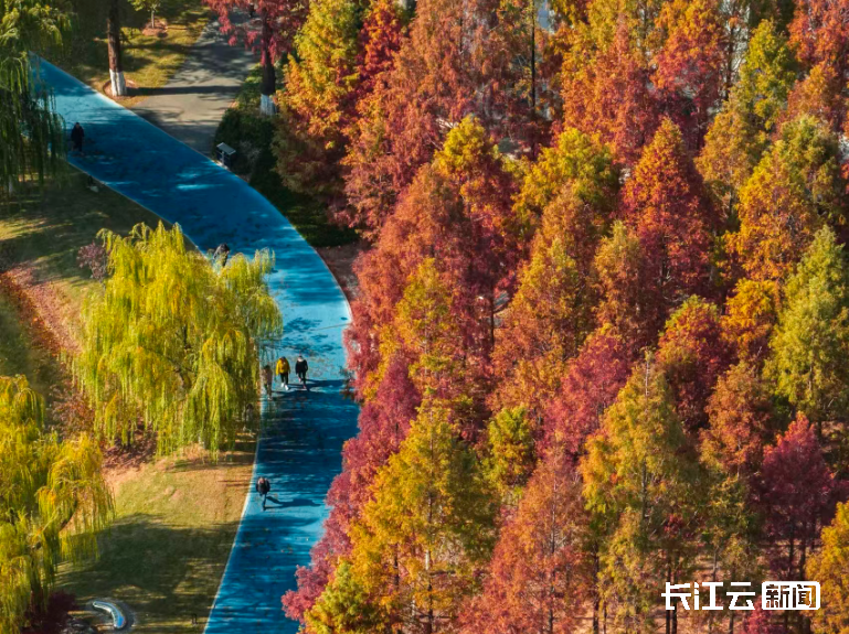 初冬时节,武汉市江汉区常青公园迎来了一年中最绚烂的时节——金陵红枫与水杉林已进入最佳观赏期。园内数百株树木层林尽染,将整个公园装点成一片红色海洋,成为城市中一道亮丽的风景。