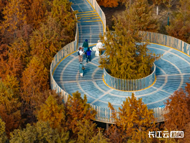 据了解,常青公园拥有多种色叶树木。其中,金陵红枫151棵,为2021年底公园改造后重新开放时引进的特色树种,也是江汉区属公园中独有的品种;另有水杉355棵,并搭配鸡爪槭、乌桕等色叶植物,形成丰富的季相景观。这些色叶树种的观赏期主要集中在11月底至12月,如乌桕、榉树大约在10月下旬至11月中下旬左右,金陵红枫观叶期在11月底至12月中旬左右,水杉观叶期则持续整个12月份。期间树叶由绿色逐渐转变为红色,或橙红或深红,色彩变化层次分明,吸引了众多游客和摄影师前来欣赏和记录,成为初冬最美的风景之一。
