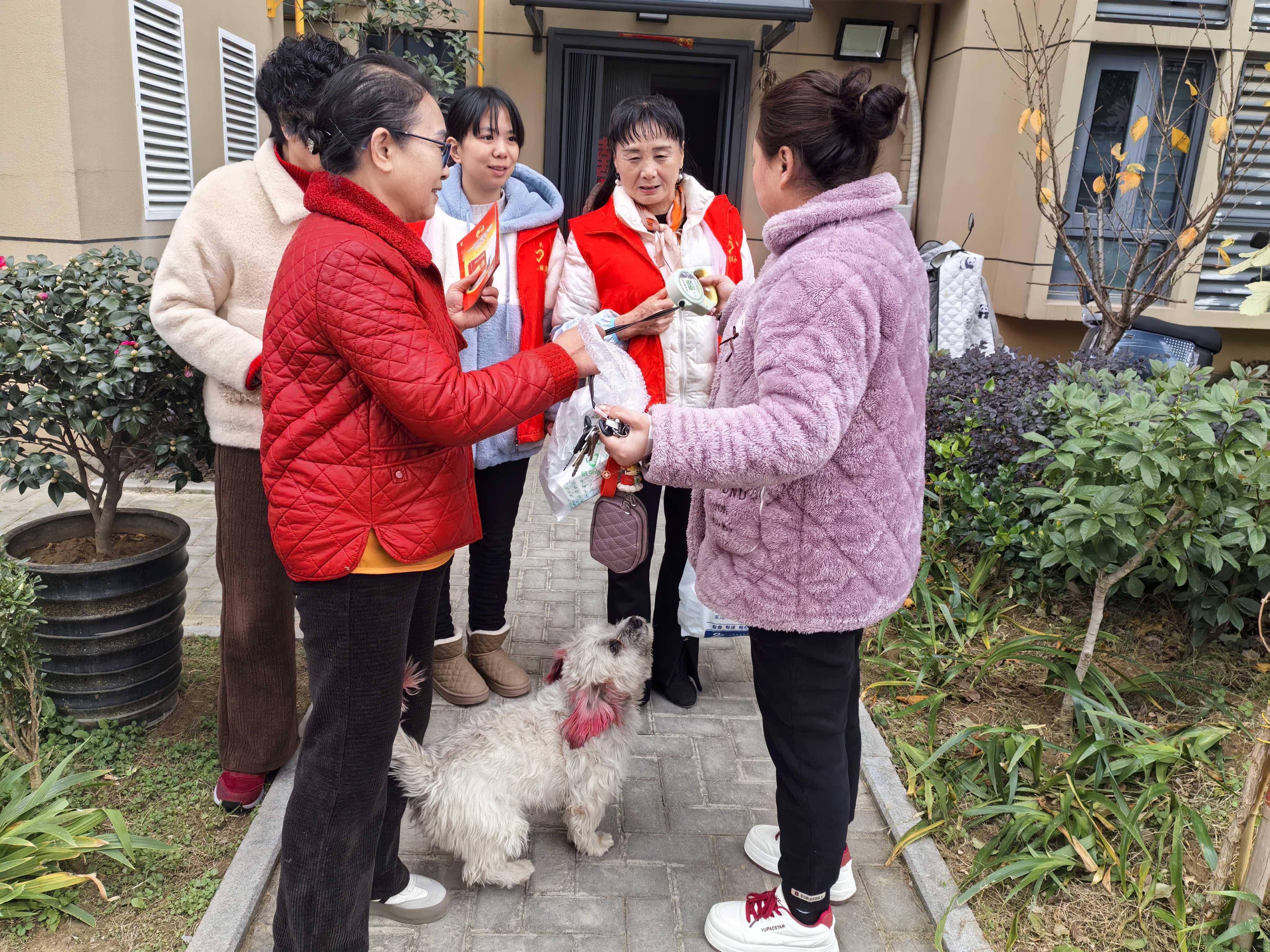 交流会结束后,入户宣传活动随即展开,志愿者们将文明理念与法治知识送到居民身边:为未牵绳的养犬居民免费发放狗绳,现场讲解文明养犬条例,引导居民遵守养犬规范;向过往居民派送印有文明标语的灭烟袋、钥匙扣,让文明细节融入日常生活场景;向居民发放《宪法》宣传册,推动宪法精神走进寻常百姓家。