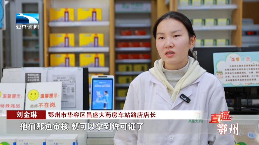 鄂州市华容区昌盛大药房车站路店店长 刘金琳:我们经常会有药械许可证的申请变更,以前是等待工作人员上门现场核验,可能需要几天左右。现在我们在网上提交申请,他们那边审核就可以拿到许可证了,对于我们来说还是比较方便的。