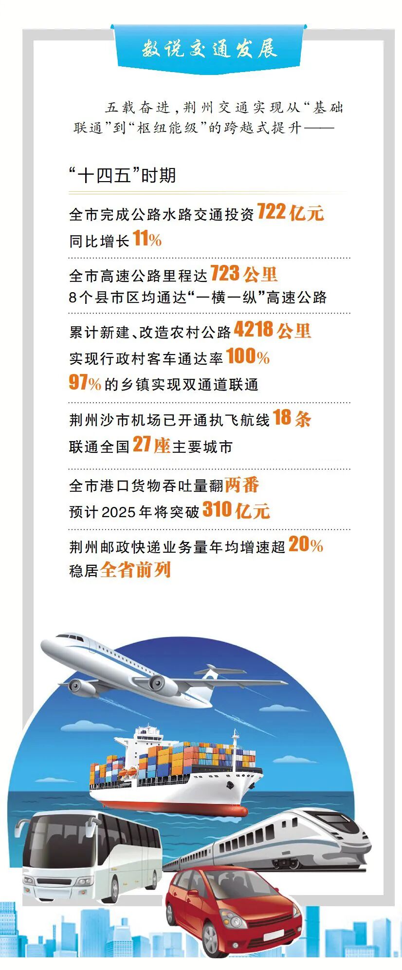 从机场振翅到高铁驰骋,从港口繁忙到村路通畅,荆州的交通巨变,是这座城市奋力赶超、开创未来的生动写照。站在新的历史起点,这座千年古城正以枢纽壮腰战略为引领,加快建设辐射全国的现代物流体系,为荆州经济高质量发展注入源源不断的动力。