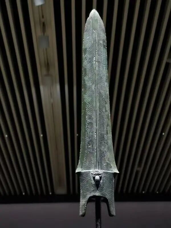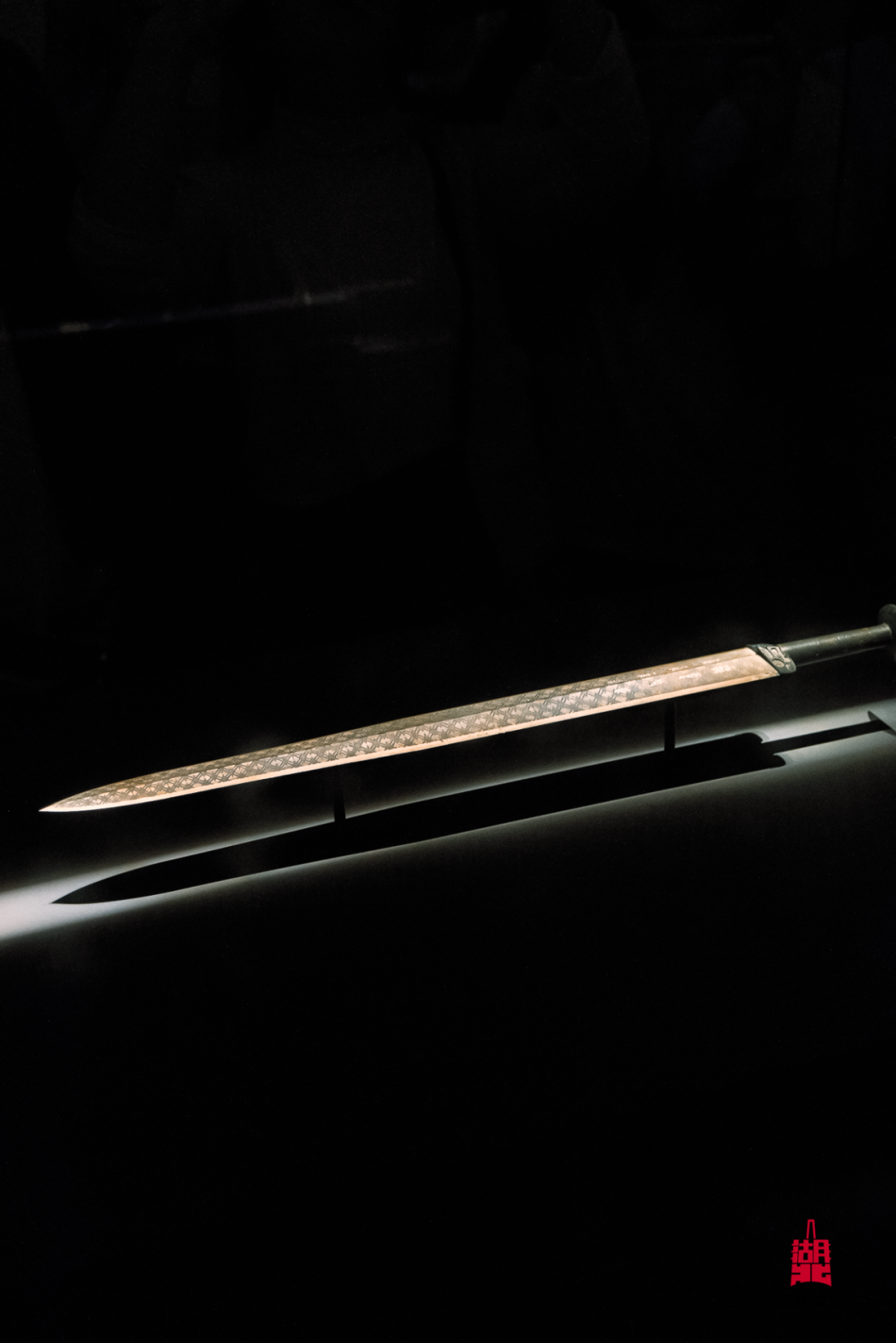 越王勾践剑,剑身布满神秘的黑色菱形暗格花纹,刻有“越王鸠浅自作用剑”的鸟篆铭文,虽深埋地下两千四百余年,出土时依旧锋利无比,光泽湛然,被誉为“天下第一剑”。