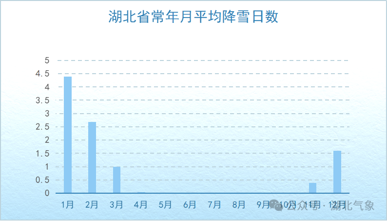 大雪节气的到来,意味着天气会越来越寒冷,下雪的可能性更大了。此时我国南方地区降雪量还比较小,往往刚下过初雪,可是北方许多地区,已经是千里冰封、万里雪飘的景象。对于我们湖北来说,常年初雪时间就在大雪期间,大雪节气之后就是冬至,冬至以后,人们就开始数着“九九”过隆冬了。从我省各地常年月平均降雪日数来看,降雪最多的月份是1月,平均4.4天。2月次之,平均2.7天。12月全省平均降雪日为1.6天,只能排第三,3月份排第四,11月有时也会出现降雪,排第五。而其他月份,除个别高海拔地区偶有降雪,全省大部分地区几乎没有雪的身影。(湖北常年月平均降雪日数排行(1991—2020年):1月>2月>12月>3月>11月>4月)