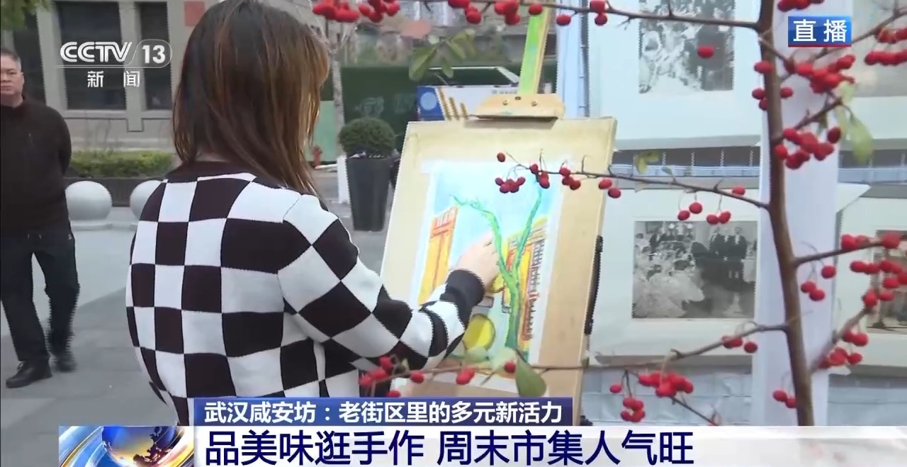 总台记者 鄢艳:我身旁这套制作精美的“荷塘三宝”,有白色的莲藕、红色的荷花、绿色的莲蓬,非常具有湖北本土特色,看上去是不是很像装饰品摆件?其实它们是可以吃的绿豆糕。这里还有同样精致的菊花、牡丹等各种造型的传统糕点。旁边的画作摊位上,摊主正在即兴绘制咸安坊的场景。