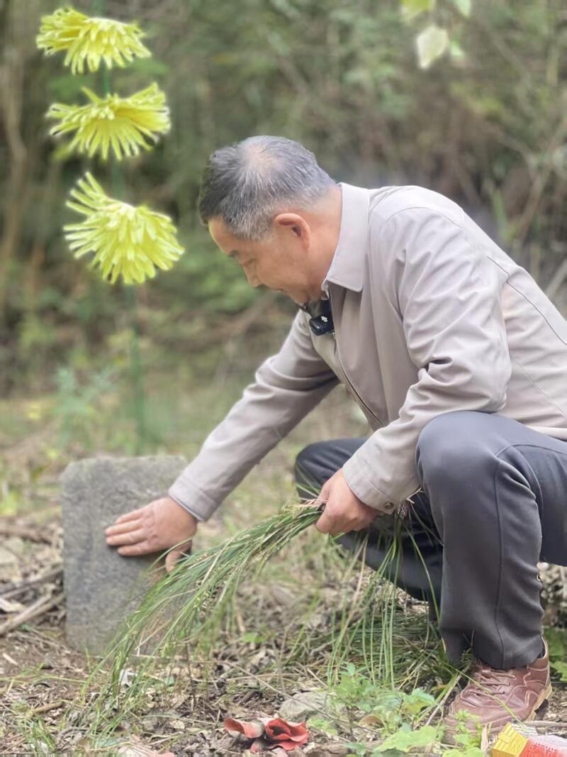 冯美成蹲下身,用手拂去碑旁的杂草与落叶。他动作细致轻柔,仿佛在照料一位安睡的长辈,“这位朱子清烈士,从几千里外的浙江来,把生命永远留在了我们金盆架。”他的讲述将时光拉回到烽火连天的1941年。