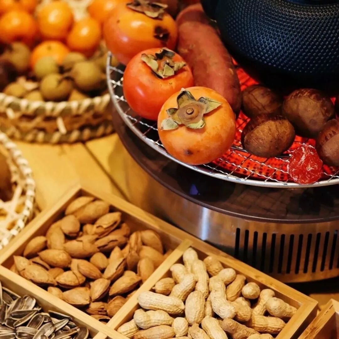 围炉煮茶更是少不了的仪式感。炭炉上架着粗陶壶,里面煮着普洱或桂圆红枣茶,旁边摆着烤得滋滋冒油的栗子、年糕,三五好友围坐一圈,喝茶、聊天、烤点心,炭火噼啪作响,茶香袅袅,连时光都变得慢悠悠的。