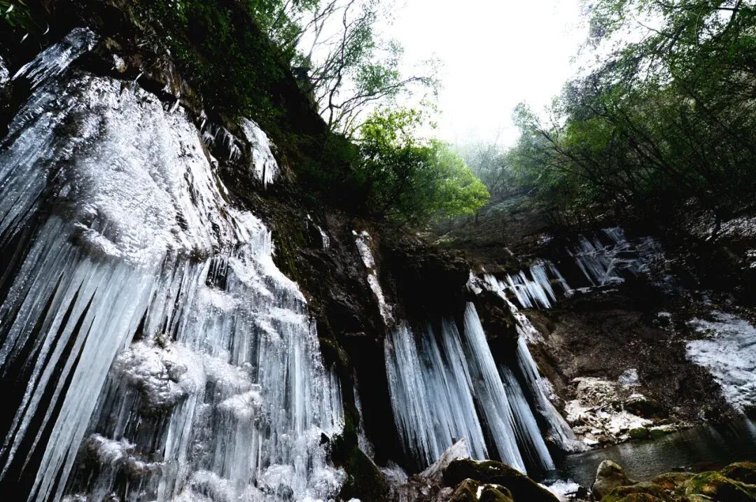 若说保康的冬景是幅画,那雪便是最灵动的笔墨。五道峡的峡谷间,雪片轻吻着奇石碧水,往日里湍急的溪流凝成剔透的冰瀑,挂在黛色崖壁上,像极了大自然亲手雕琢的水晶帘。