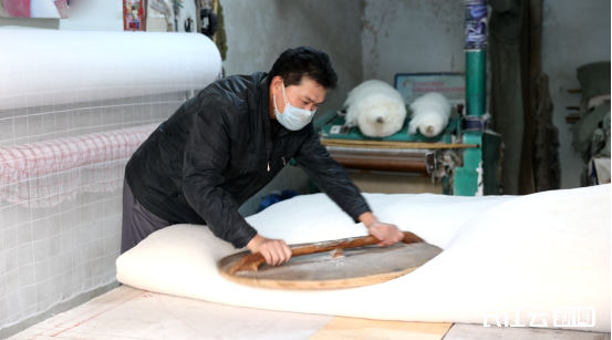 “核心是弹花和铺花,这里面藏着大学问。”麻贤林道出坚守的门道。铺棉最考验功力,力道不均、手法不当会导致棉絮厚薄不一,直接影响保暖性和舒适度,“即便棉花和机器相同,手艺到位才能铺出平整均匀的棉胎,这是机器替代不了的。”