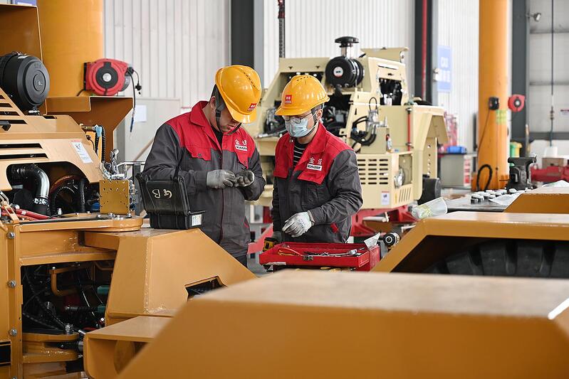 湖北金诚信公司生产车间工人在组装矿山设备
