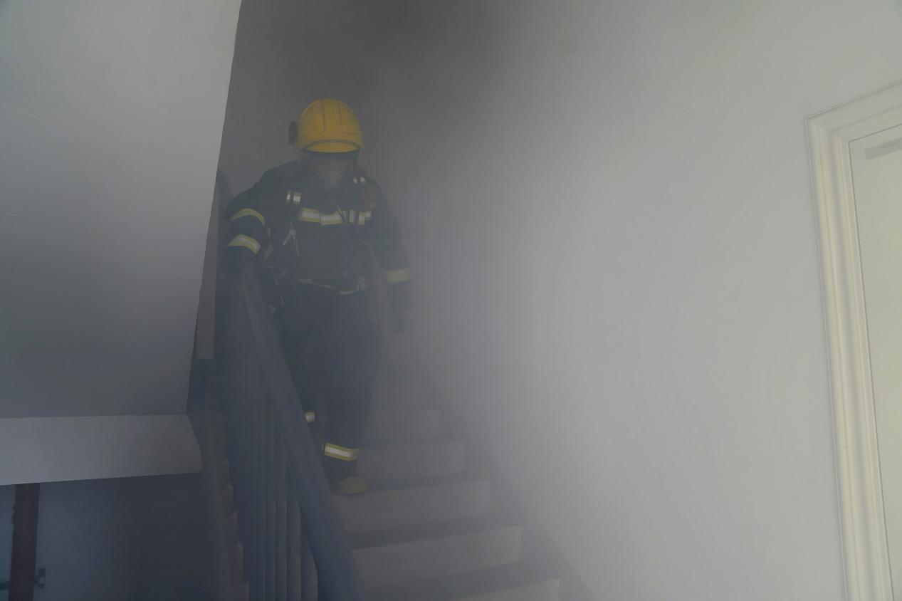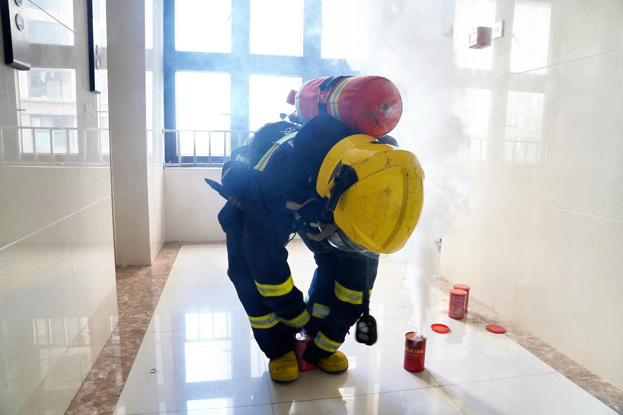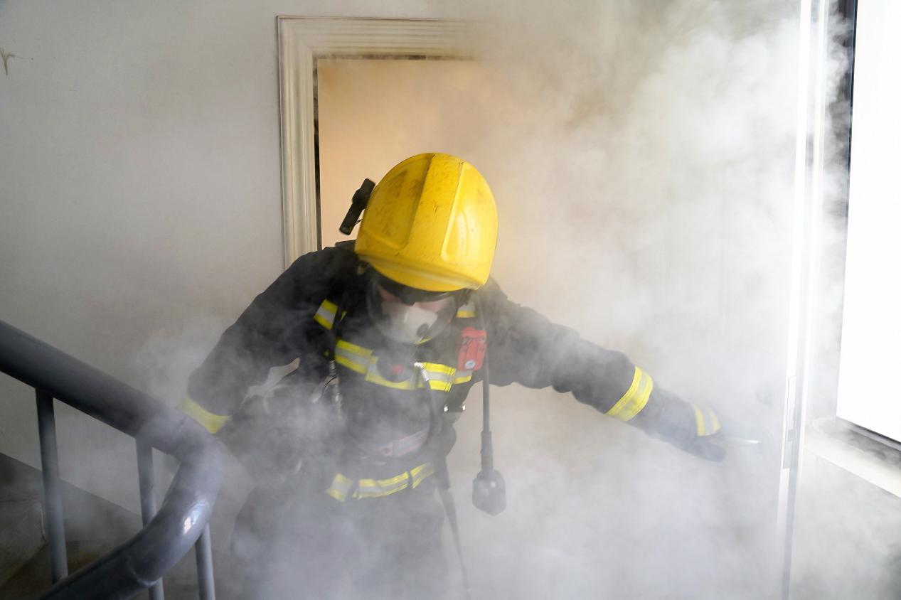 此次实验使用发烟罐模拟火灾初期烟气产生的场景,将发烟罐置于5层电梯前室,消防员启动发烟罐后,烟气迅速充满整个电梯前室,在5层常闭式防火门处于关闭状态时,有极少量烟气轻微渗入疏散楼道内,且浓度随着扩散快速降低,疏散楼道内能见度保持在5米以上,未对疏散环境造成实质性影响。现场消防人员与小区业主代表模拟逃生人员在发烟罐启动5分钟后从7层沿疏散楼梯向1层撤离时,全程未受到浓烟干扰,逃生路线清晰可辨,被困人员可以安全通过这条“生命通道”疏散。