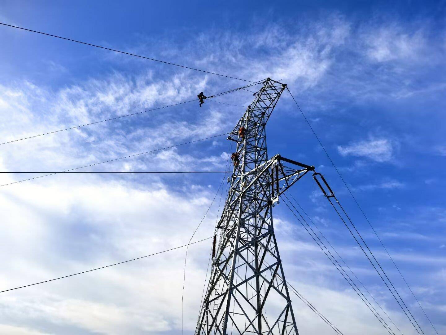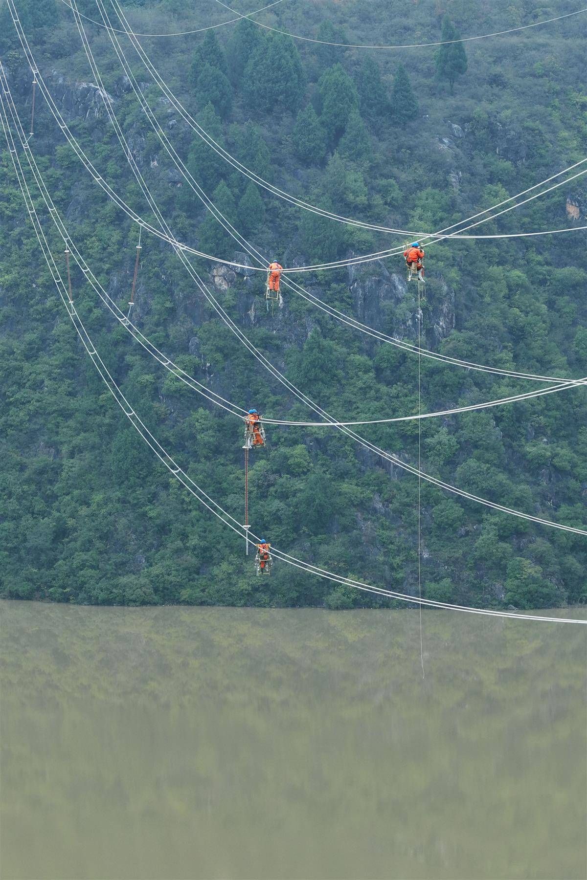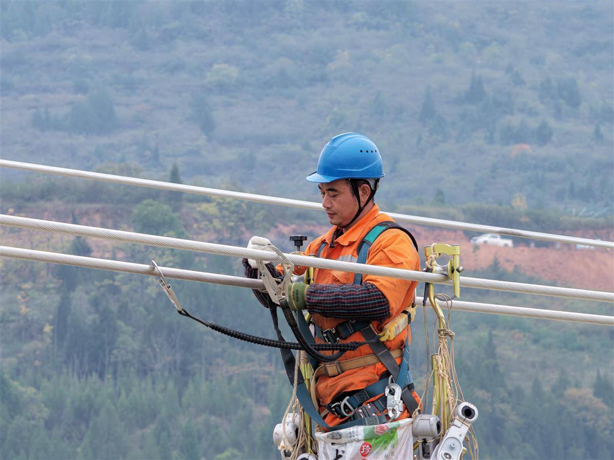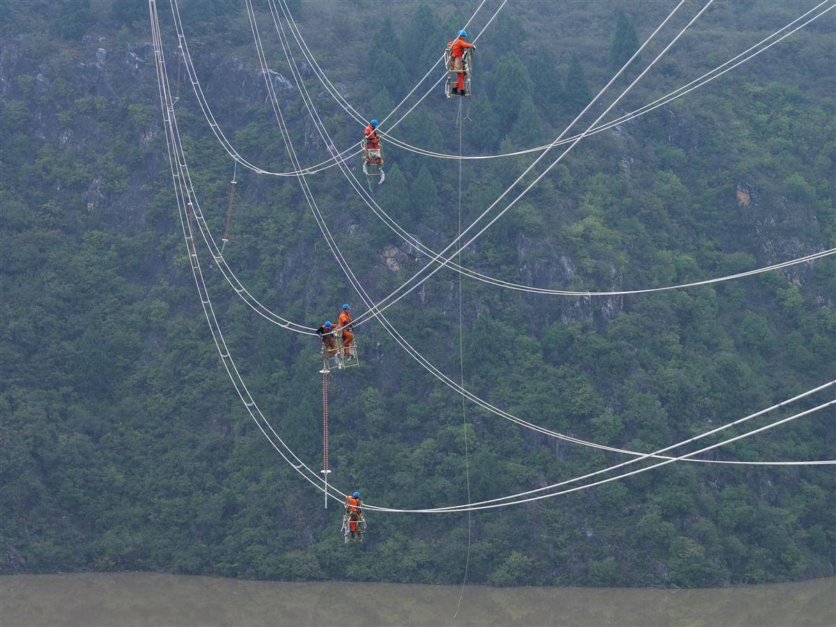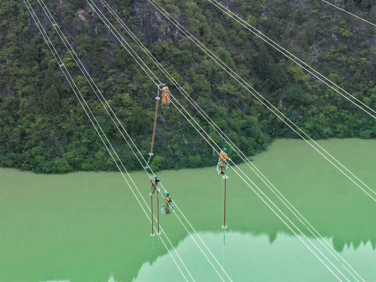 在湖北十堰郧阳区青山镇琵琶滩村的汉江河谷,国网十堰供电公司施工人员在高空导线上安装间隔棒等线路附件。