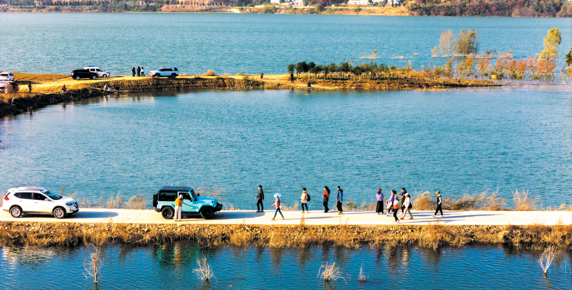 这里没有城市的喧嚣,只有风声、水声和偶尔的鸟鸣,三两好友走在路中央,无需更多造型,随手一拍就是大片。
