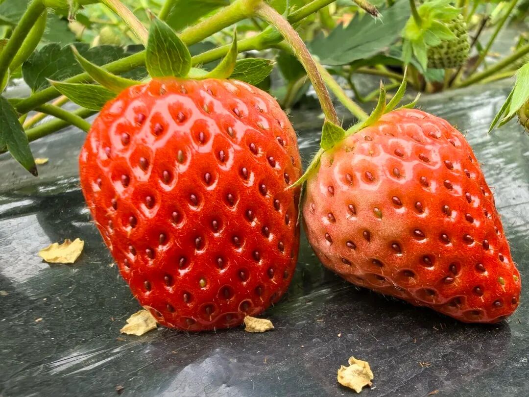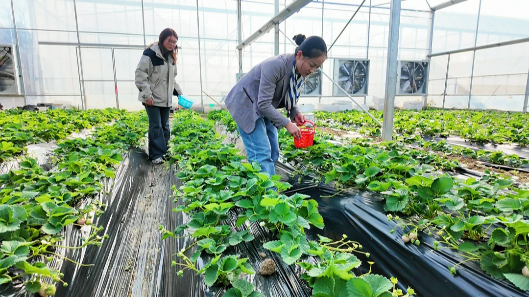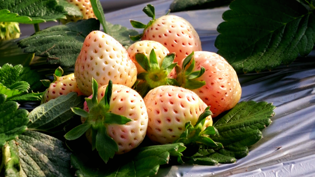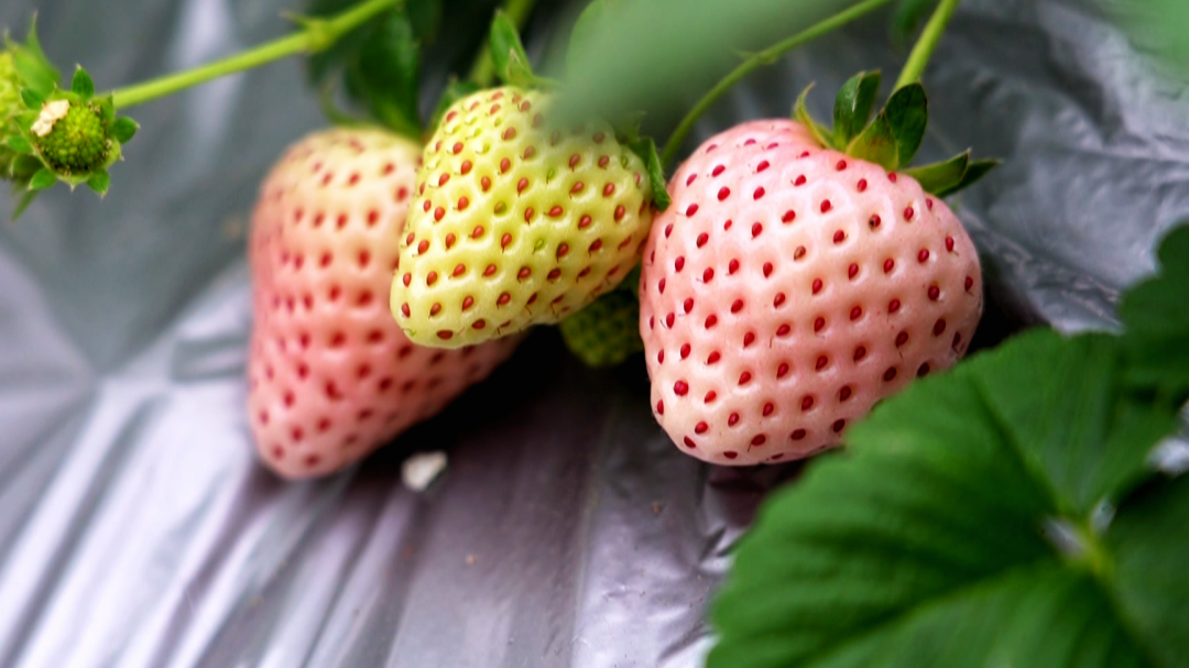 走进种植园的智能大棚,清甜的果香扑面而来。翠绿的藤蔓间,一颗颗形态饱满、色泽鲜艳的草莓点缀其中,白如凝脂、粉若云霞、红似玛瑙,吸引了不少游客前来采摘。