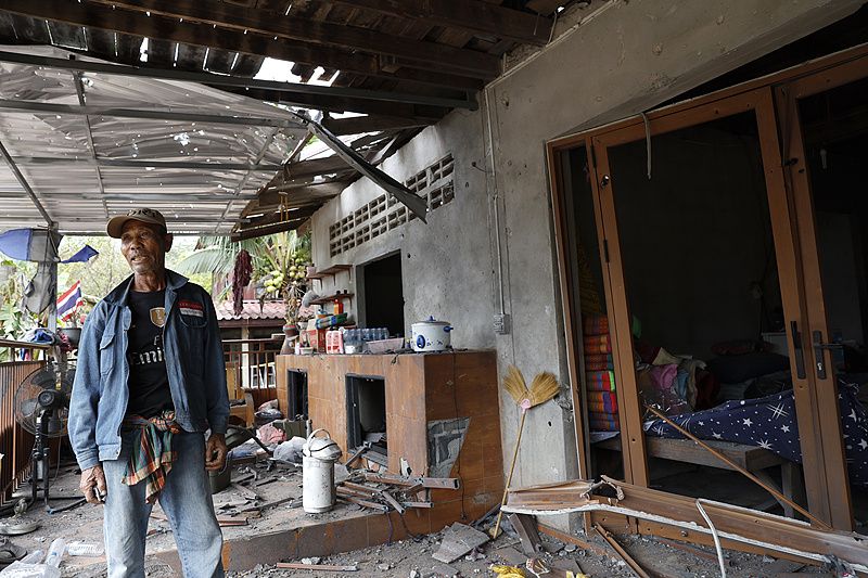 △当地时间12月10日,一名泰国村民查看自家在冲突中受损的房屋。图源:央视新闻