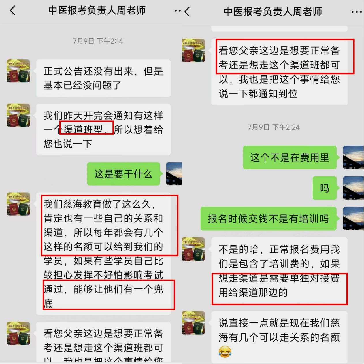 家住江夏区的梁女士告诉记者,她父亲是一位年过六旬的乡村医生,一直想拥有“中医医术确有专长人员医师资格”。今年上半年,她交7800元帮父亲在慈海教育咨询(武汉)有限公司报名。7月9日,公司负责与梁女士对接的周老师通知她,说公司“有几个可以走关系的名额”,推出一个“渠道班型”可以给学员“兜底”。