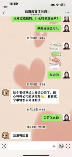 尽管找不到公司固定办公场所,阮女士偶尔还能联系上慈海教育江老师,但公司口头承诺的“线下服务”无人过问。今年11月,阮女士得知自己资格考核并未通过,试图要求退费时,江老师表示,已经把阮女士的诉求上报给公司。