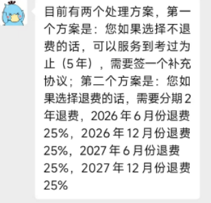 根据总公司退费方案,当初承诺的“未过即退”,变成了延长服务周期或者2年内分4次退费。
