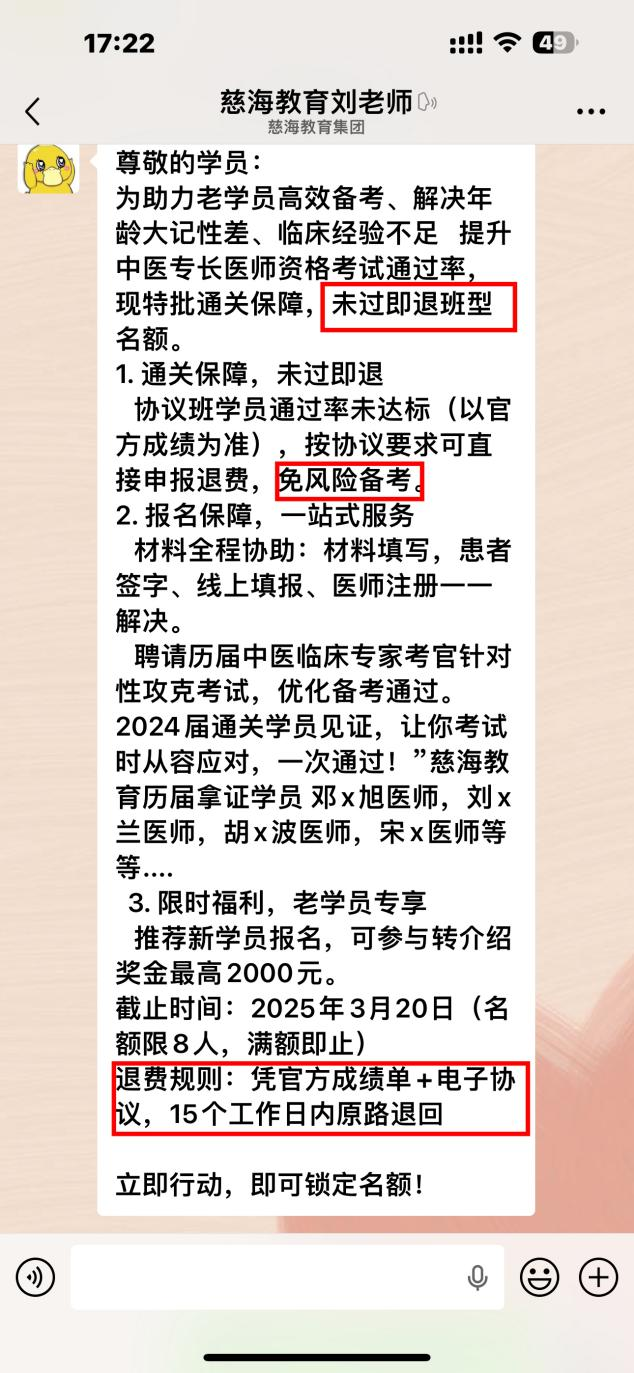 和梁女士的父亲一样,市民阮女士缴费也报名参加该项培训。今年3月11月,阮女士收到慈海教育刘老师针对老学员的“福利帖”,称公司推出“未过即退班型”“名额限8人”……