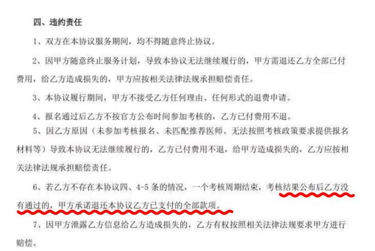 梁女士作为乙方与甲方慈海教育签署了“服务协议书”,其中第四条“违约责任”中明确,“考核结果公布后乙方没有通过的,甲方承诺退还本协议乙方支付的全部款项。”