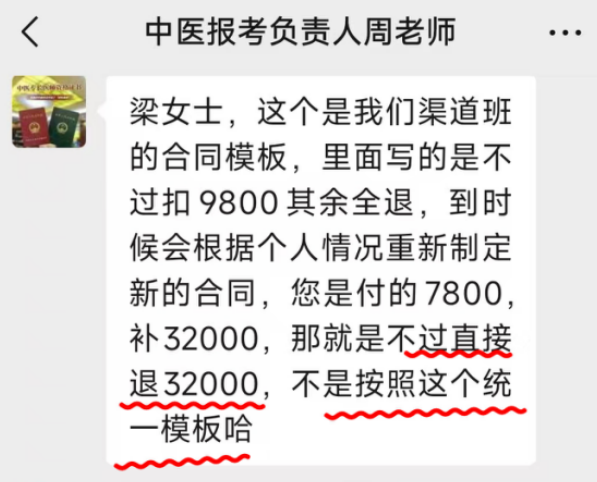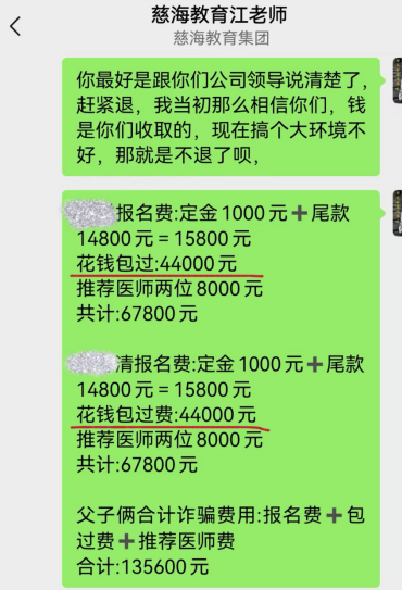 像梁女士、阮女士一样在“渠道班”“未过即退班型”“内部VIP班”“名额有限”的饥饿营销下,通过补交大额费用,为资格考核“兜底”的学员不在少数。市民孙先生在慈海教育“代老师”的推介下进行了补交45440元成功“升班”。