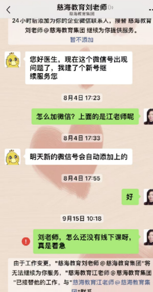 于是,阮女士向此前一直跟她对接的刘老师咨询,却发现“慈海教育刘老师”的微信号出了问题,重新添加后变成了慈海教育江老师。