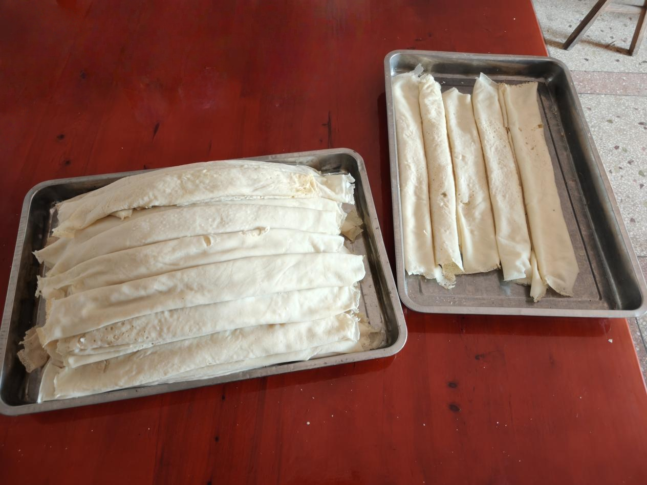 “每年必做豆折,不仅是为了过年解馋,更是想让孩子们记住家乡的味道。”徐伙军一边翻晒豆皮,一边望着身旁认真学习的晚辈说道。豆折的制作,从来不只是食物的烹制,更是一场家族情感的传承。当年轻人围在灶台边,从长辈手中接过木勺与菜刀,学着掌控火候、拿捏米浆浓度时,他们接过的不仅是一门手艺,更是一份对土地的眷恋、对传统的敬畏,以及藏在烟火气里的乡愁与牵挂。