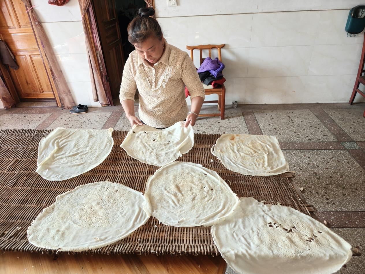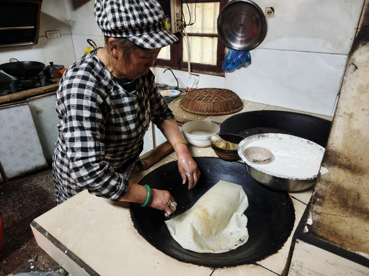 12月9日一大早,崇阳县石城镇石壁村70岁的徐伙军家香气四溢。灶台边,徐伙军夫妇与邻里们围站成圈,添浆、摊皮、翻面、晾晒,分工明确又默契十足,柴火的噼啪声、米浆的香气,交织成最地道的乡村风味。