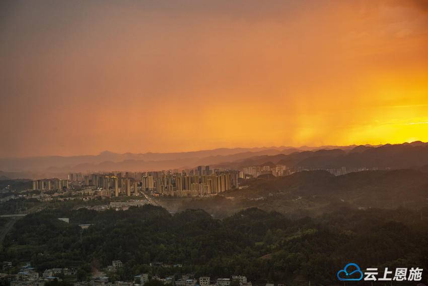 每至黄昏,夕阳便开始在天际铺陈色彩。起初是淡淡的橘黄,温柔地漫过金字山的山脊,给错落的草木镀上一层暖光。山脚下的利川城,高楼林立却不失温婉,玻璃幕墙反射着初霞的微光,无数道光影在楼宇之间慢慢变换。渐渐地,霞光愈发浓烈,橘黄染成绯红,绯红又变成胭脂,漫天云霞似燃起的火海,将半边天空烧得滚烫。落日悬在远山之巅,如一枚巨大的金橘,圆润饱满,光芒柔和却极具穿透力,将云层染成金红交织的绸缎,连空气都仿佛染上了蜜糖般的暖色调。