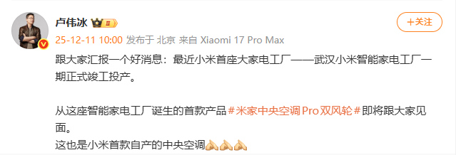 12月11日,小米集团总裁卢伟冰正式官宣,武汉小米智能家电工厂自研自产的首款核心产品「米家中央空调Pro双风轮」即将重磅上市。这不仅是小米首款自产中央空调,更标志着小米大家电业务迈入自研自产的全新阶段,而武汉小米智能家电工厂厂长徐鹰那句“未来五年内,将小米空调产品打造为中国市场前三品牌”的宣言,更是让行业看到了小米冲击家电头部阵营的坚定决心。