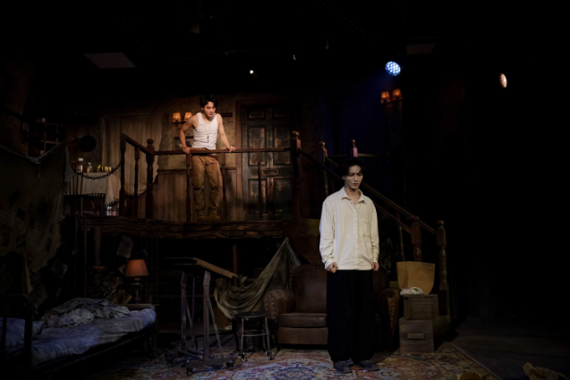 与传统剧场不同,这里没有高筑的舞台、遥远的座席。百余座位紧挨舞台铺陈,即便最后一排也能纵览全场。舞台被布置成一栋老式二层小楼,钢琴、沙发、壁橱与木质楼梯共同构建出主人公的世界。观众从踏入剧场那一刻起,便已置身于故事之中。