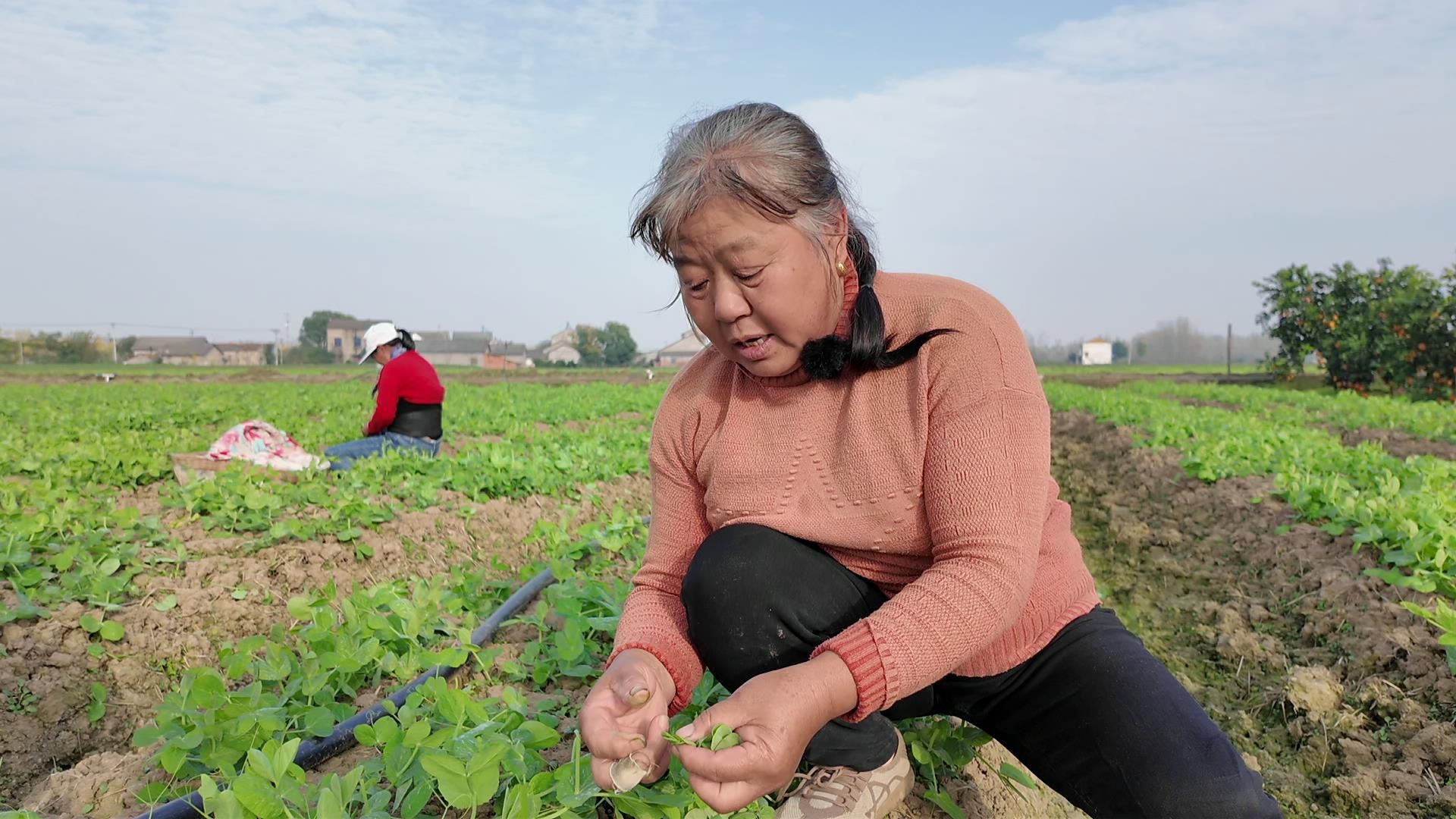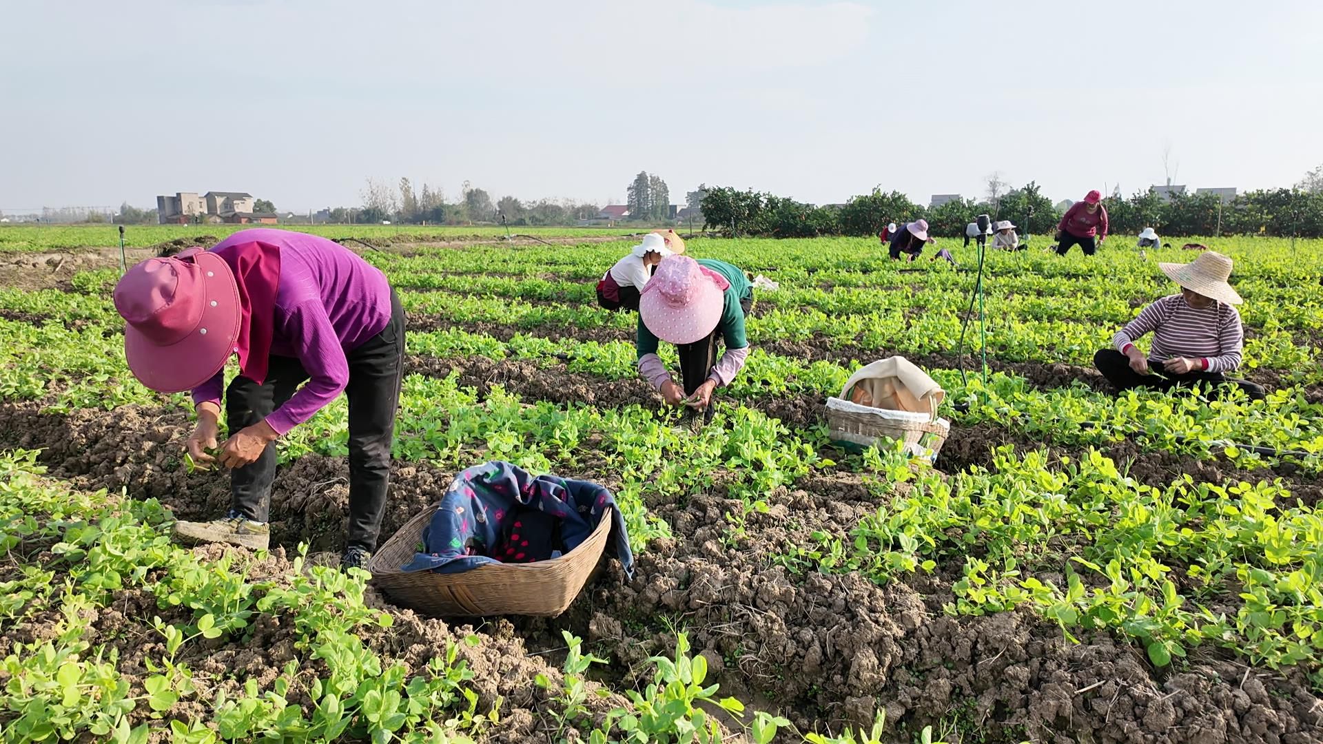 位于问安镇龚桥村的沃然农业豌豆尖种植基地,绿油油的豌豆尖长势正旺。数十位村民正弯腰忙碌,熟练地掐下嫩尖。“叶子从中间一掐,去掉头尾,轻轻拉掉两侧的‘胡须’,这就是最标准的豌豆尖。”村民梁志梅一边演示、一边介绍。