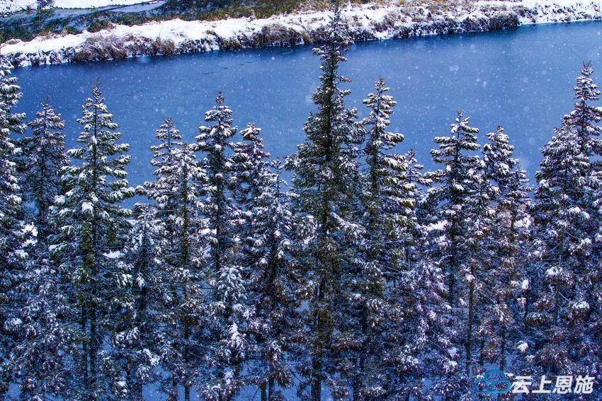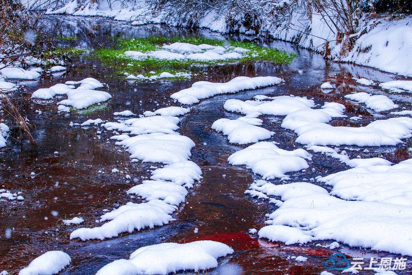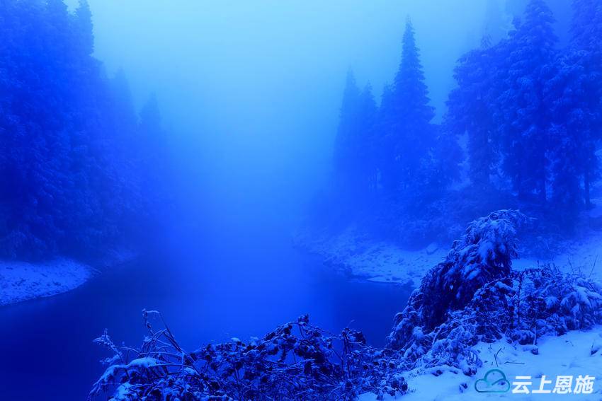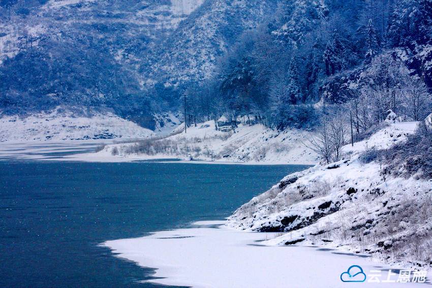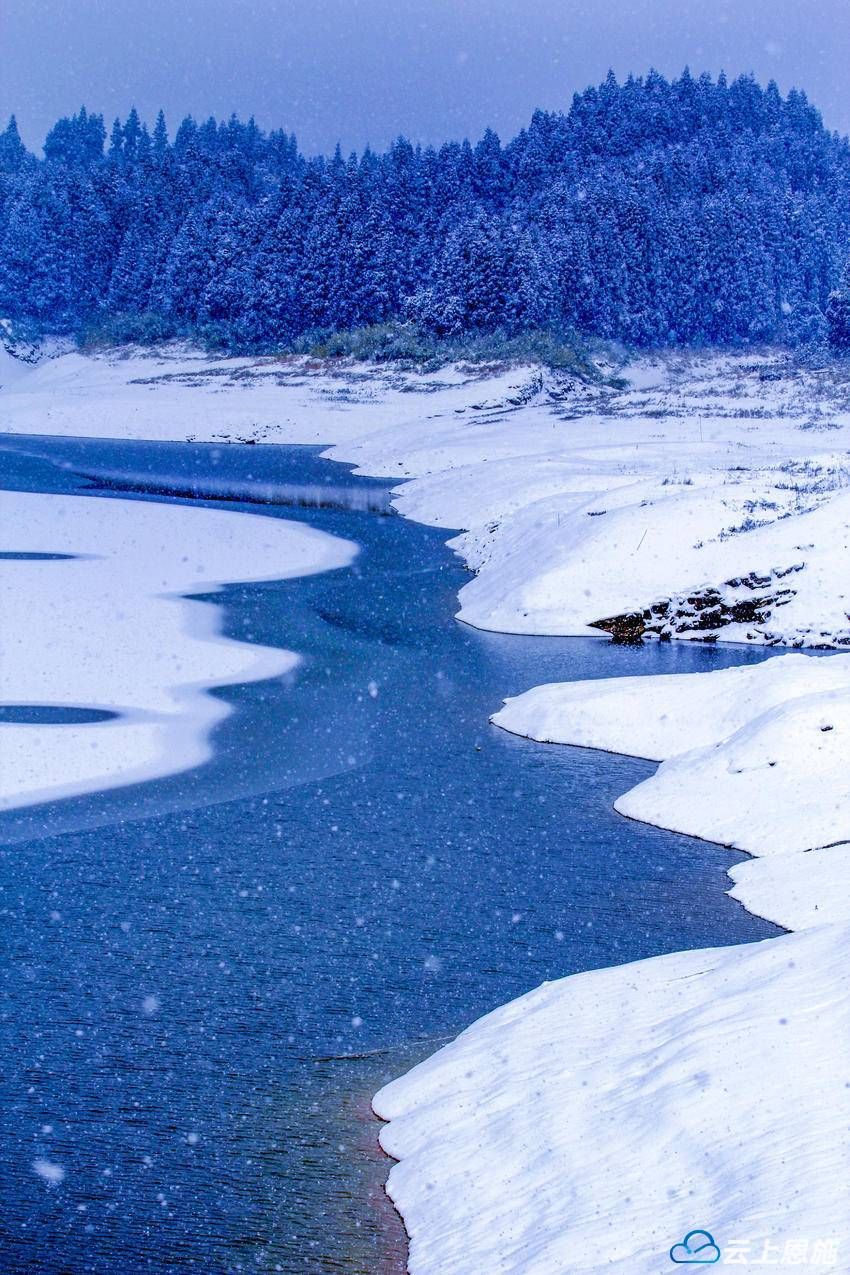 郁江源头的月泉坝是雪后的秘境。泉水从地下汩汩涌出,在岸边凝结成层层叠叠的冰挂,如同白玉雕琢的珊瑚。两岸的树木裹着厚厚的积雪,枝丫低垂,仿佛在聆听泉水的私语。雪落在水面上,先是化作一圈圈涟漪,渐渐地,岸边凝结出薄冰,冰下的泉水依旧欢腾,叮咚作响,像是大自然奏响的冬日恋歌。偶尔有山雀落在雪地上,啄食着草籽,留下一串串小巧的脚印,为这片静谧增添了几分灵动。