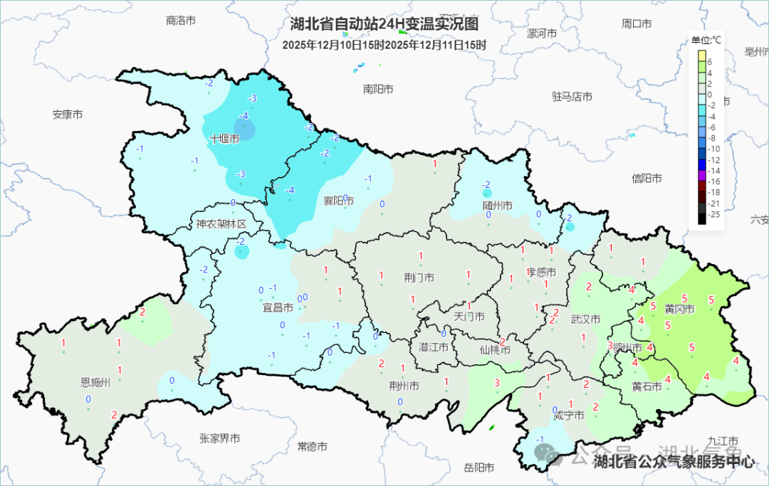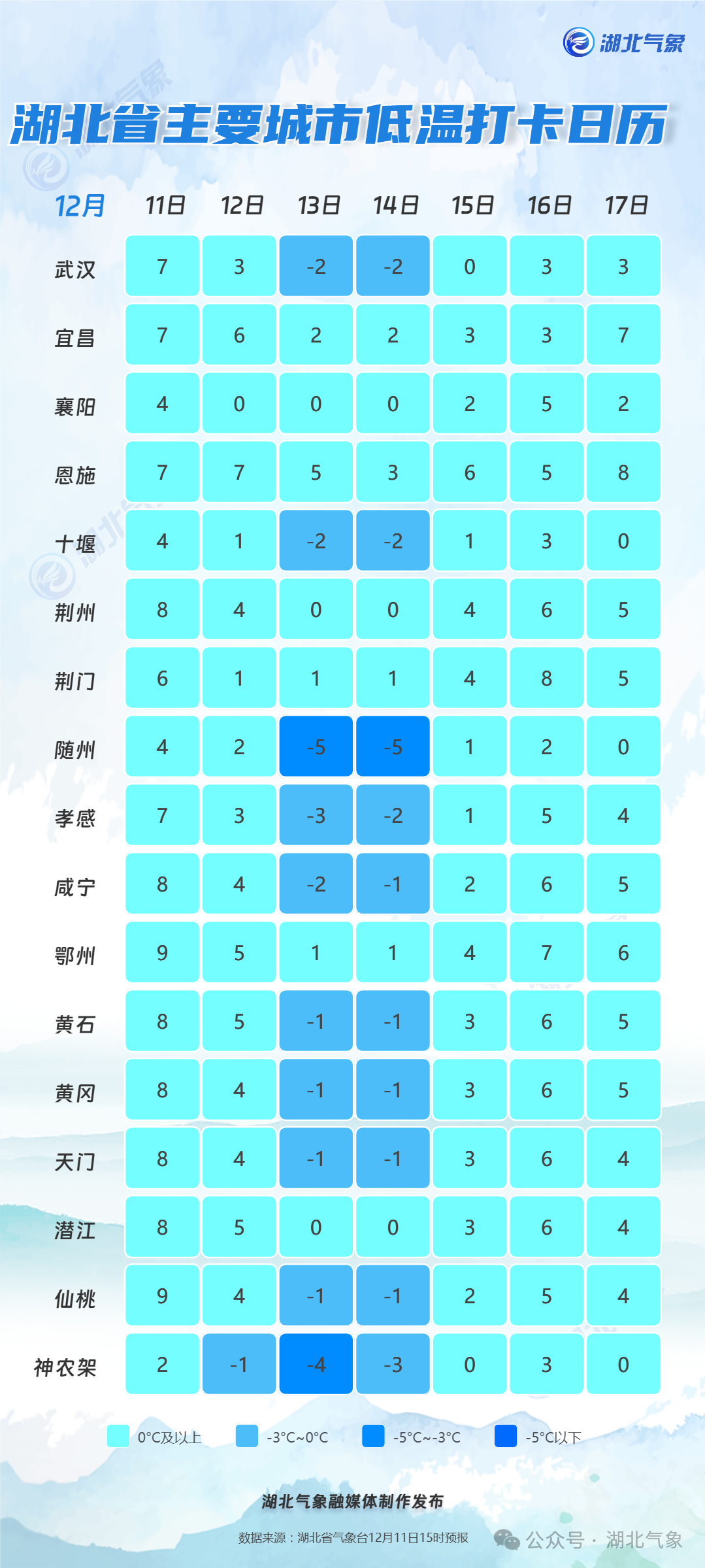 预计12日至13日白天,我省将有寒潮大风天气,大部地区平均气温下降 6~11℃,其中宜昌东部、随州、荆门、 荆州、孝感、武汉、仙桃、天门、潜江、鄂州、黄冈、黄石、咸宁下降8~11℃,14日早晨最低气温北部-5~-2℃,南部-2~3℃;期间有偏北风4~5级,阵风6~9级;12日十堰、襄阳、神农架、恩施北部、宜昌西部高海拔地区有中到大雪。