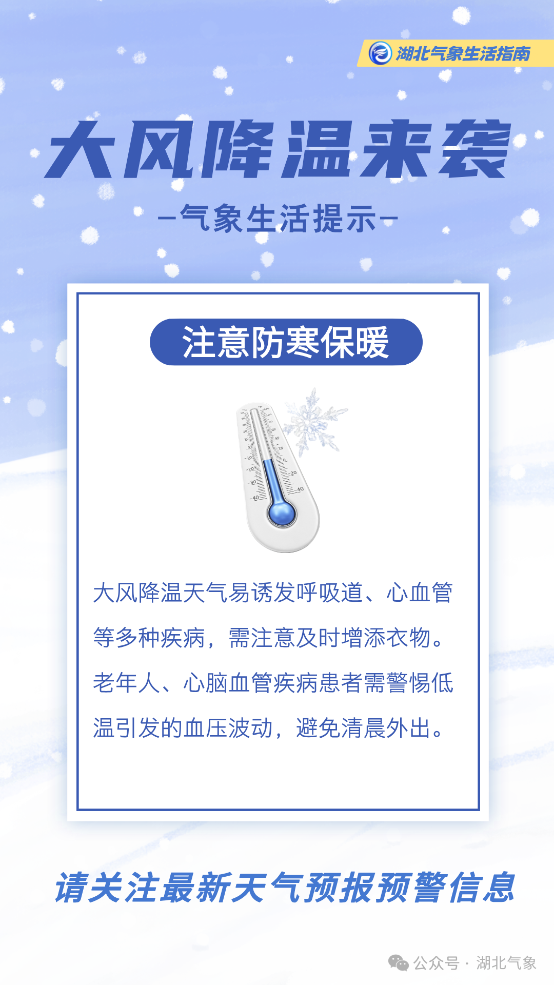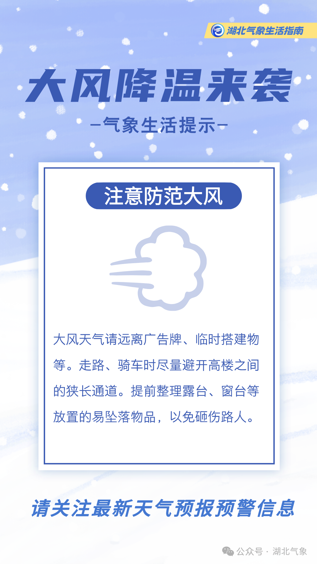 提醒公众此轮寒潮天气携大风雨雪来袭,请关注天气预警预报,提前安排出行,注意交通安全。同时,湖北大部将迎大幅降温,未来三天早晨最低气温普遍在冰点以下,需及时添加衣物,谨防感冒等呼吸系统疾病。大风时段应远离广告牌和临时搭建物等,谨防高空坠物。