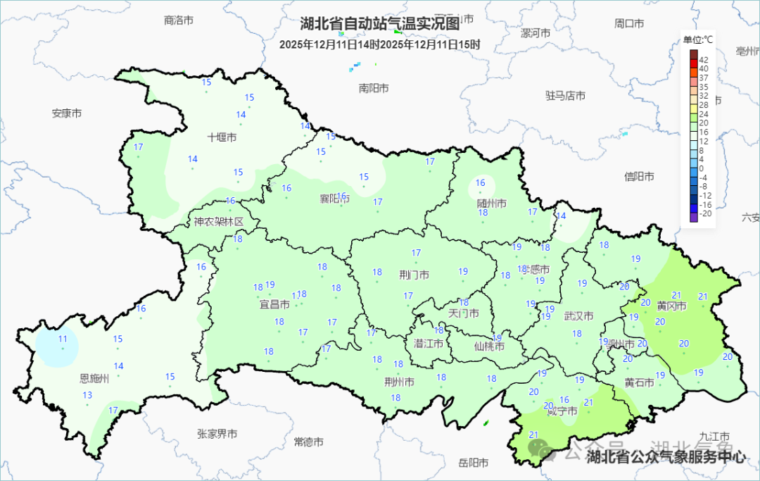 12月11日20时-12日08时,鄂西北、鄂西南、江汉平原西部多云转小雨,鄂西北高海拔地区有雨夹雪或雪;其他地区多云。最低气温鄂西北1~5℃、其他地区5~10℃,偏北风2到3级转3到4级、阵风5到6级。