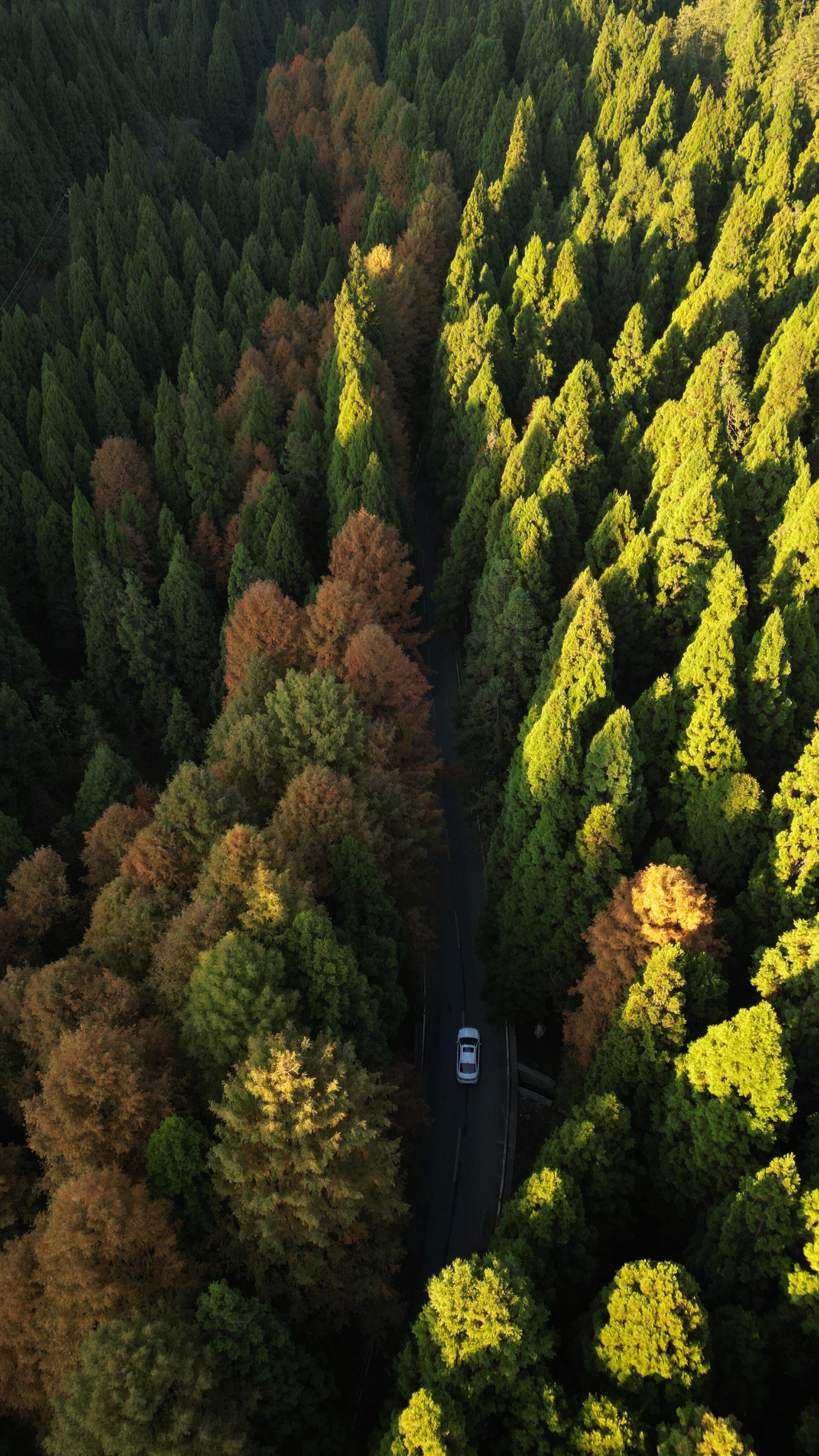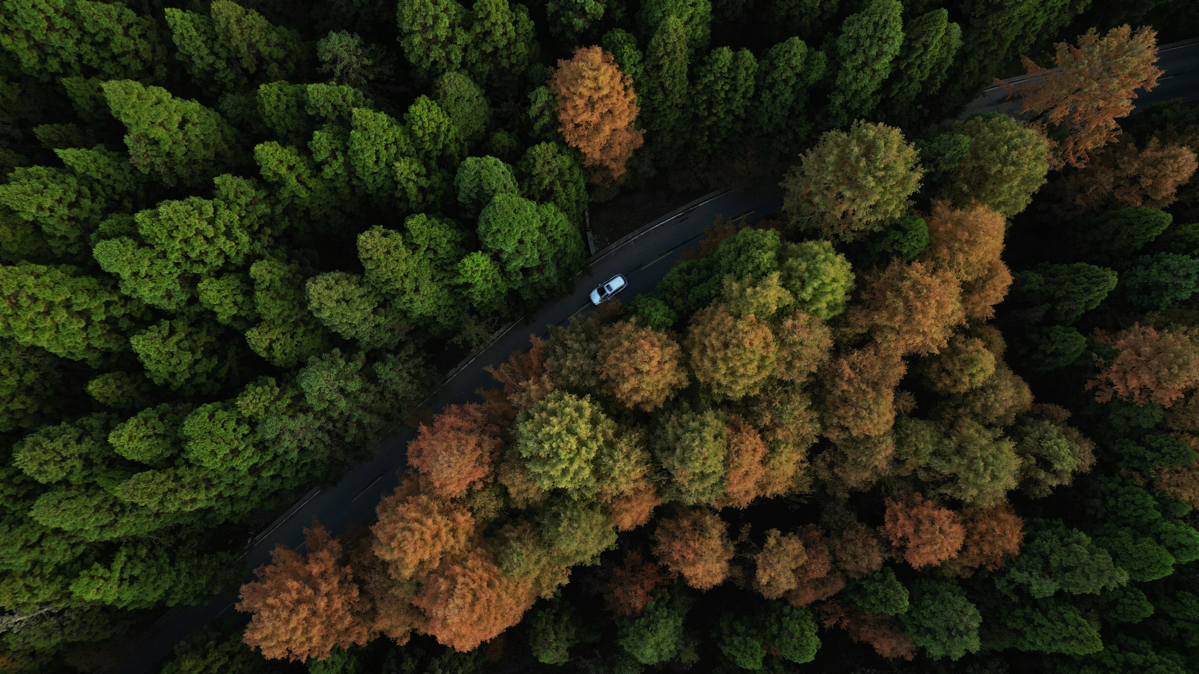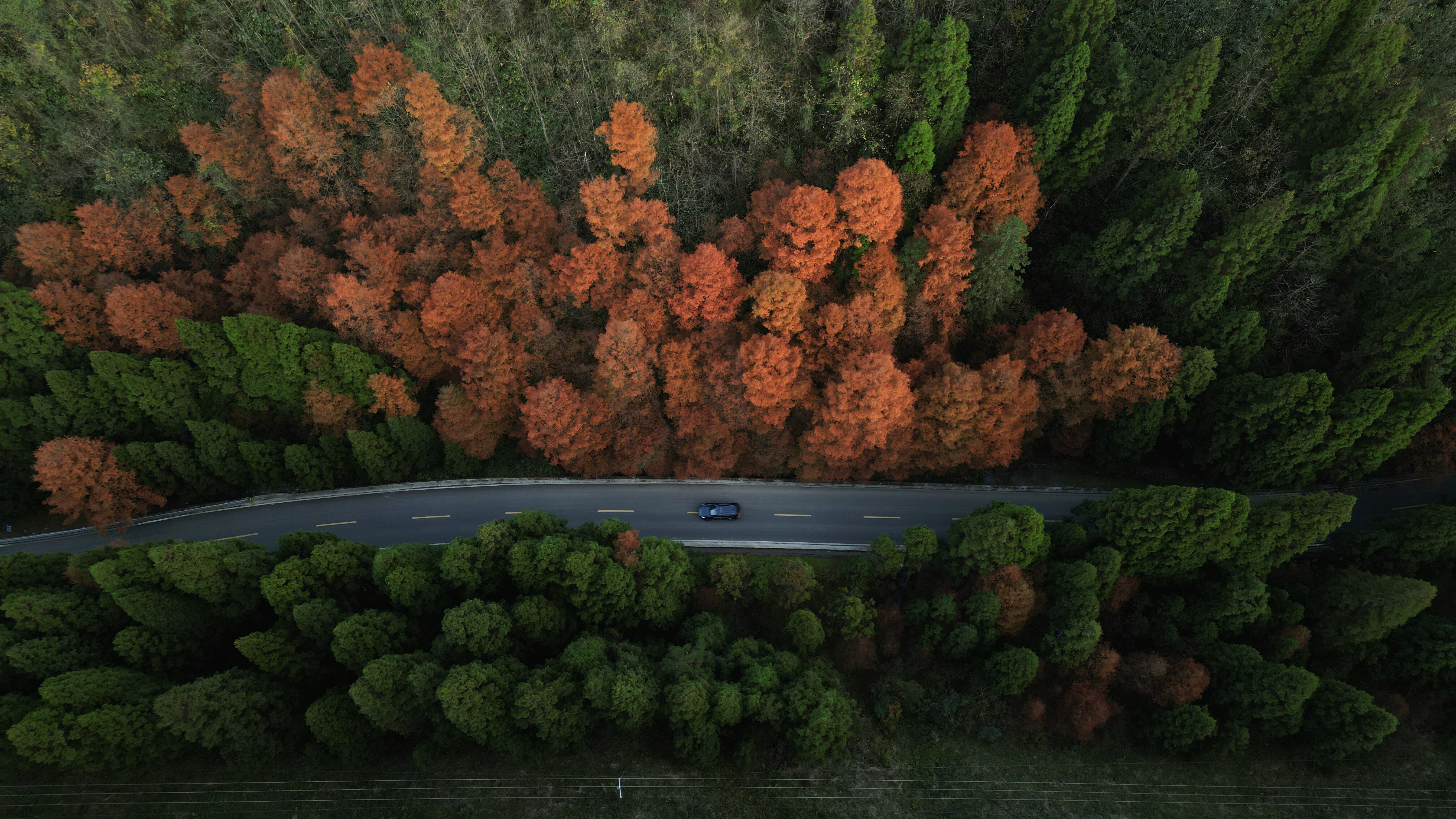 初冬时节,咸丰县坪坝营国家森林公园,红绿相间的植被彰显季节的更迭,汽车在色彩斑斓的森林中穿行,如在画中。
