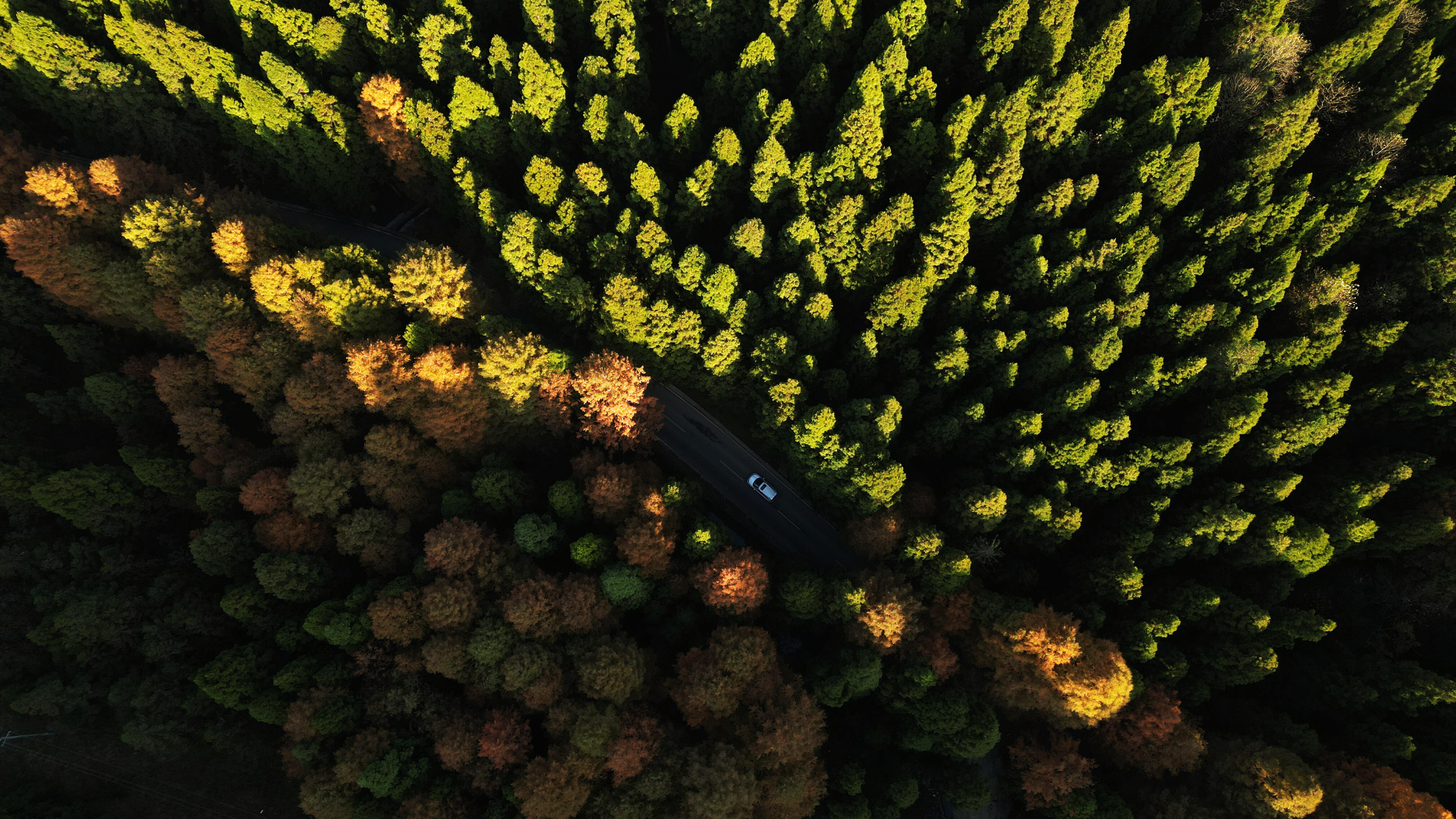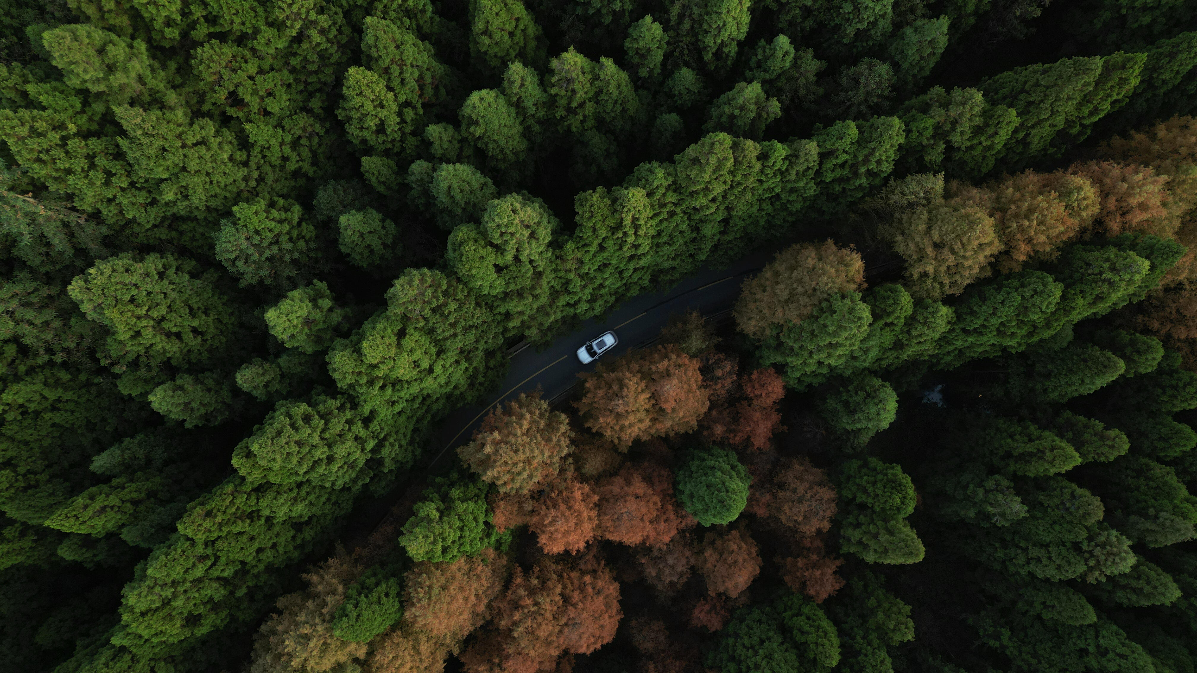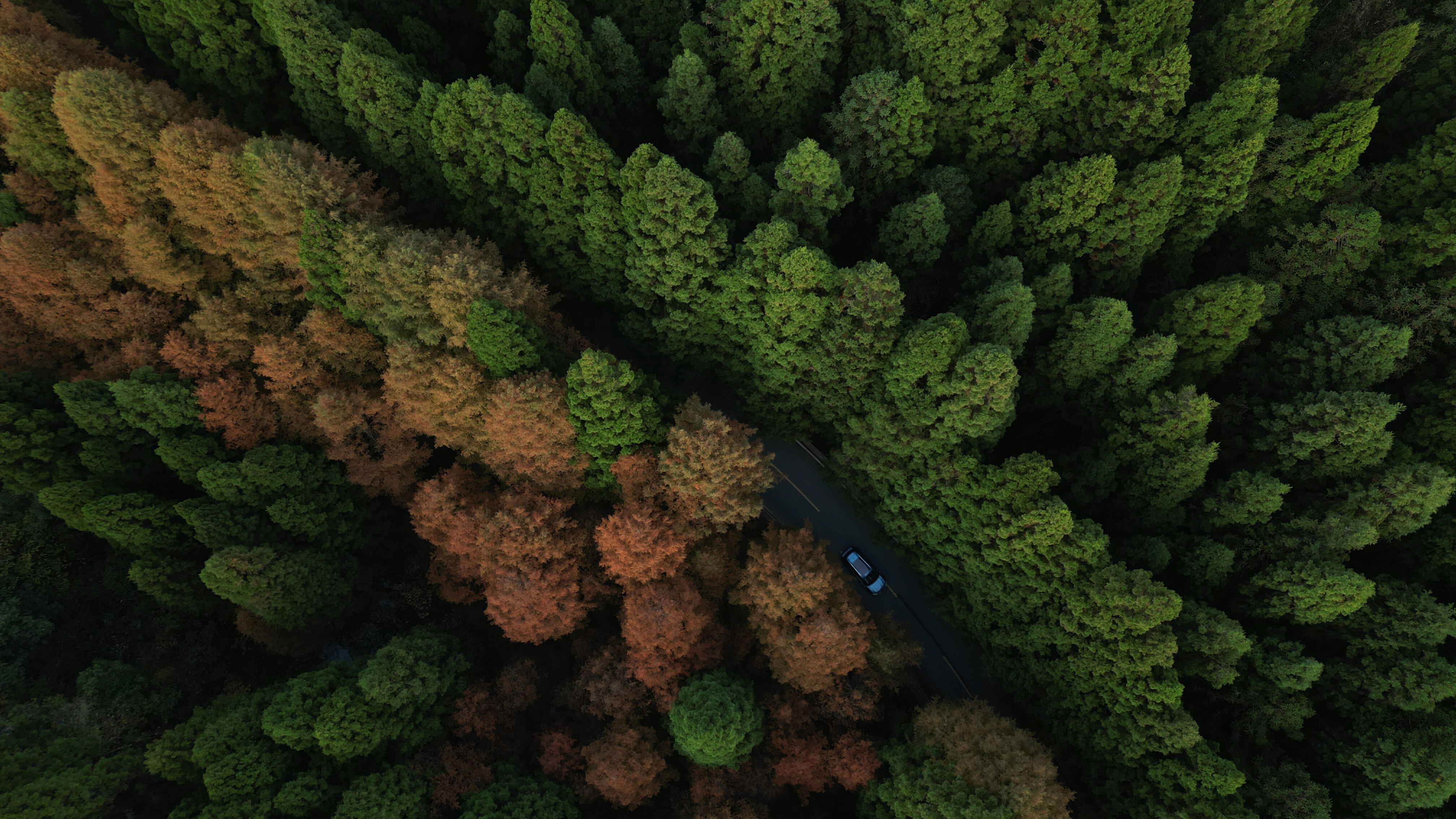 初冬时节,咸丰县坪坝营国家森林公园,红绿相间的植被彰显季节的更迭,汽车在色彩斑斓的森林中穿行,如在画中。
