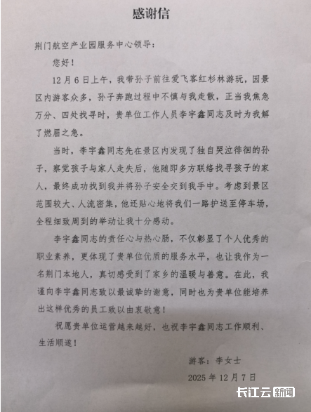 “真是太感谢小李了!”事后,李女士特意写了一封感谢信送到园区,字里行间满是感激:“不仅是李宇鑫同志,整个园区的服务都让人安心。遇到困难有人帮,身处景区不慌乱,这就是家乡的温度啊!”