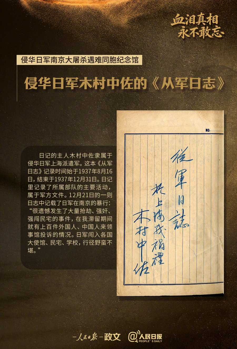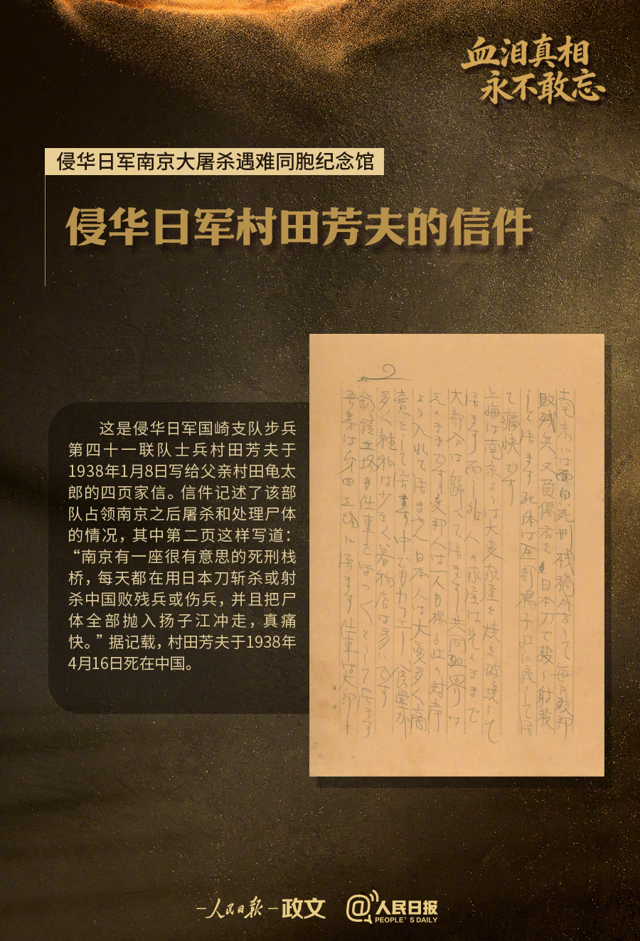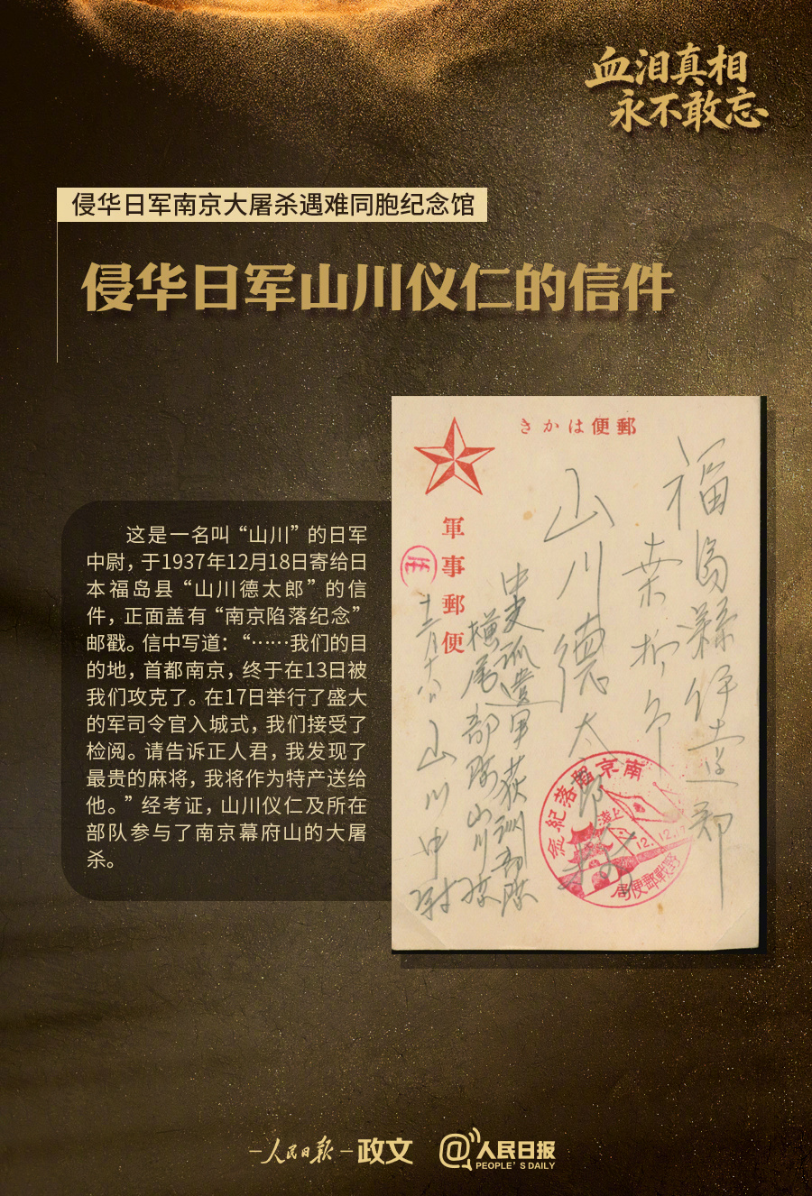 侵华日军的暴行照片集、盖有 “南京陷落纪念” 邮戳的信件、报道 “百人斩” 竞赛的报纸......每一件文物,都是固定历史真相的铆钉。今天,第十二个国家公祭日,昭昭前事,惕惕后人。不能忘!不敢忘!