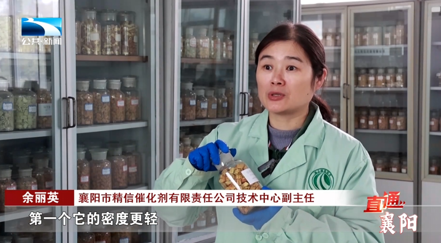 襄阳市精信催化剂有限责任公司技术中心副主任 余丽英:第一个它的密度更轻,第二个它的活性指标更优,就说比传统的普通催化剂要优3%到5%。