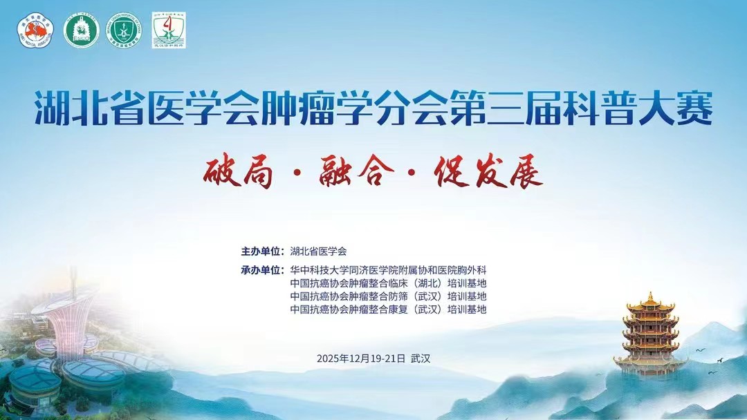 由湖北省医学会主办,华中科技大学同济医学院附属协和医院胸外科联合中国抗癌协会三大培训基地(湖北临床整合、武汉防筛整合、武汉康复整合)共同承办的2025湖北省医学会肿瘤学分会第三届科普大赛,将于12月19日在武汉盛大启幕!