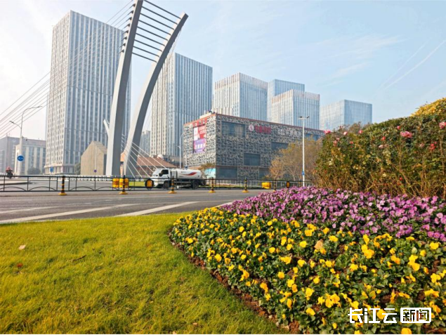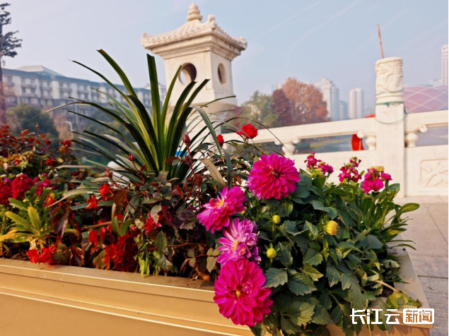 远处是湖光楼宇,脚边是花团锦簇,将城市与自然之美巧妙融合,构成一幅动静相宜的冬日画卷。两侧摆放的14组花箱把美好镶嵌在城市肌理中,把“生活里的小欢喜”种在了城市的车水马龙里。