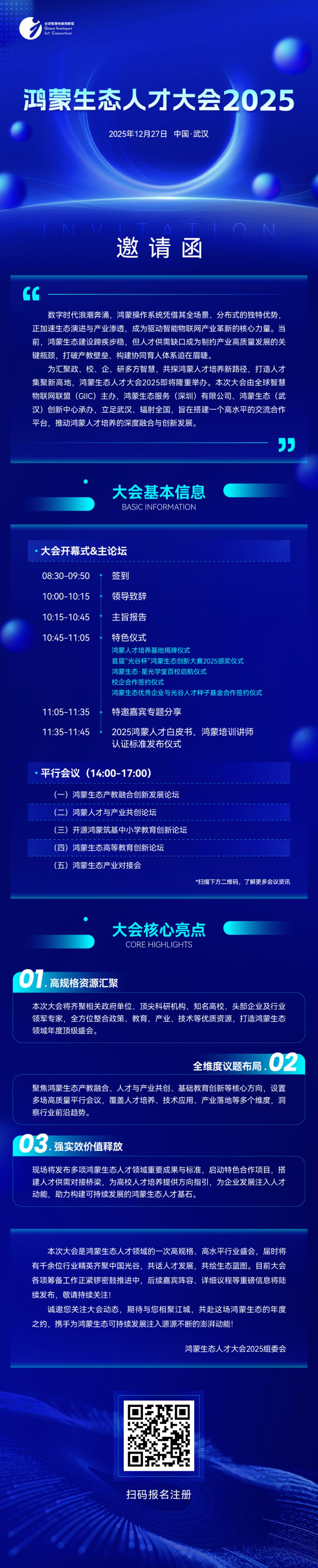 聚焦鸿蒙生态建设与人才培养核心命题,赋能数字经济高质量发展。2025年12月27日,以“新生态、新人才、新动能”为主题的2025鸿蒙生态人才大会将在光谷举办。本次大会由全球智慧物联网联盟(GIIC)主办,鸿蒙生态服务(深圳)有限公司、鸿蒙生态(武汉)创新中心联合承办,拟邀请相关主管部门、高校、培训机构、用人单位、智库、核心开发者及媒体代表等超1000人,覆盖鸿蒙人才产业链上下游全生态,共商鸿蒙人才培养体系建设,共话产业生态协同发展新路径。
