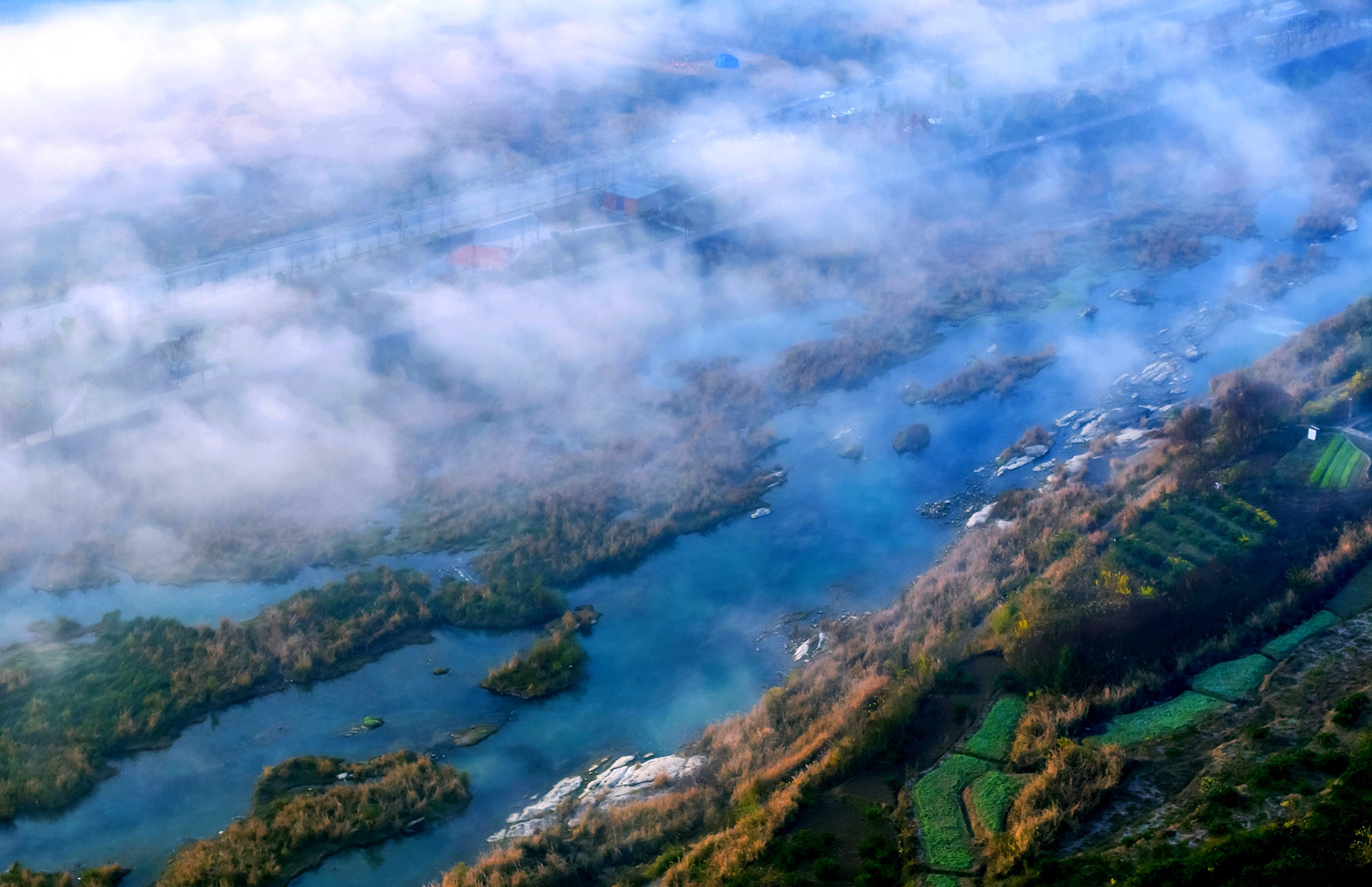 12月14日清晨,湖北省宜昌市夷陵区小溪塔最低气温骤降至1℃,长江支流黄柏河生态湿地公园内,峡谷湿地因冷暖气流交汇出现大面积平流雾景观,宛如一幅流动的山水画卷。