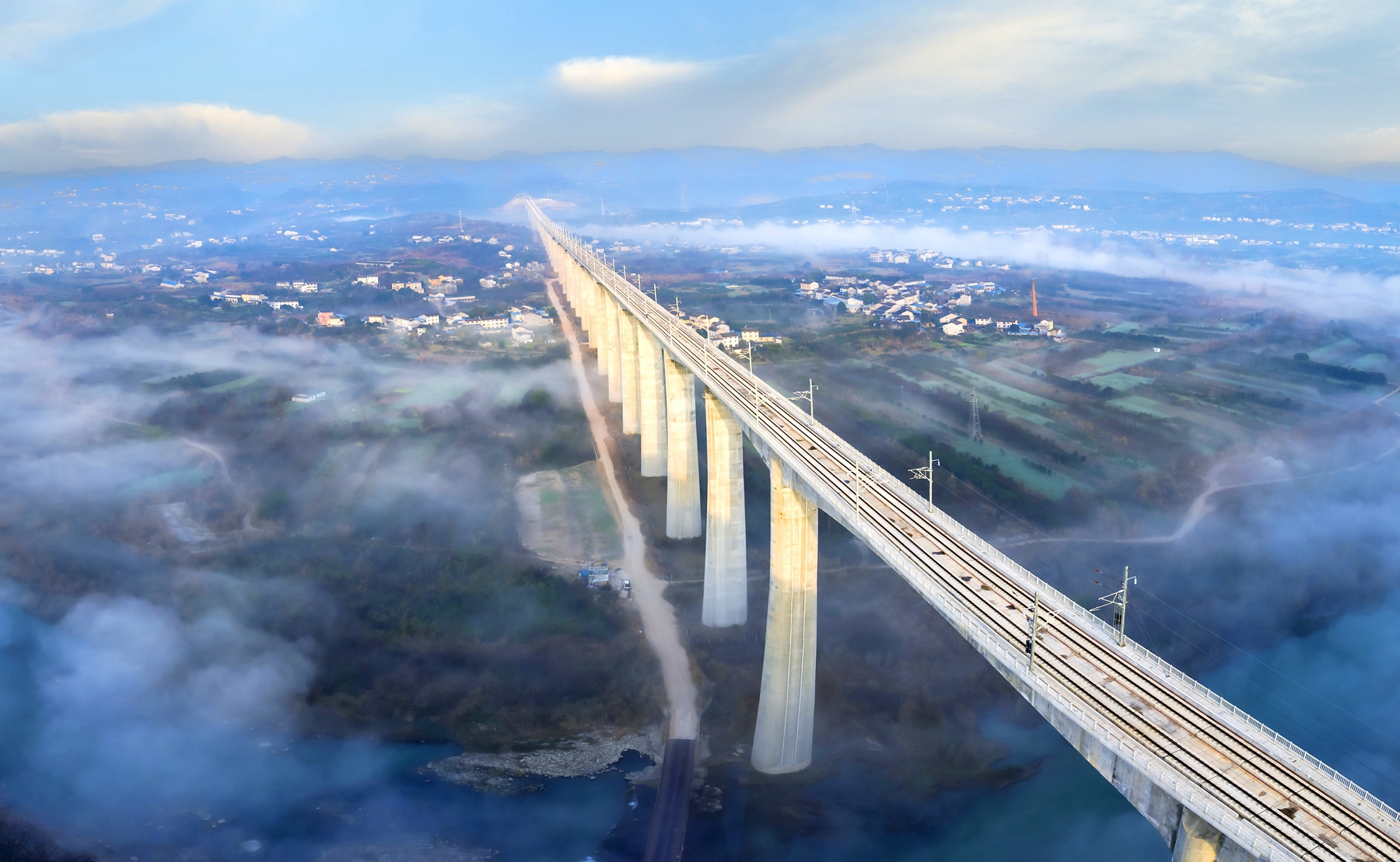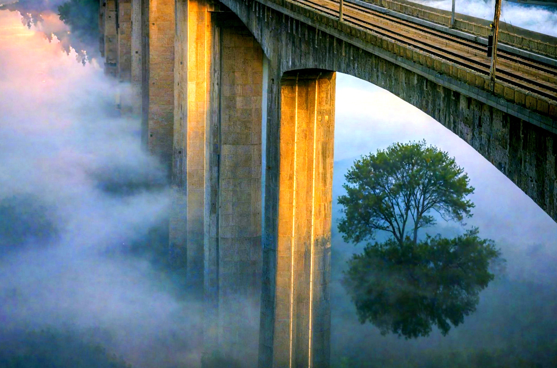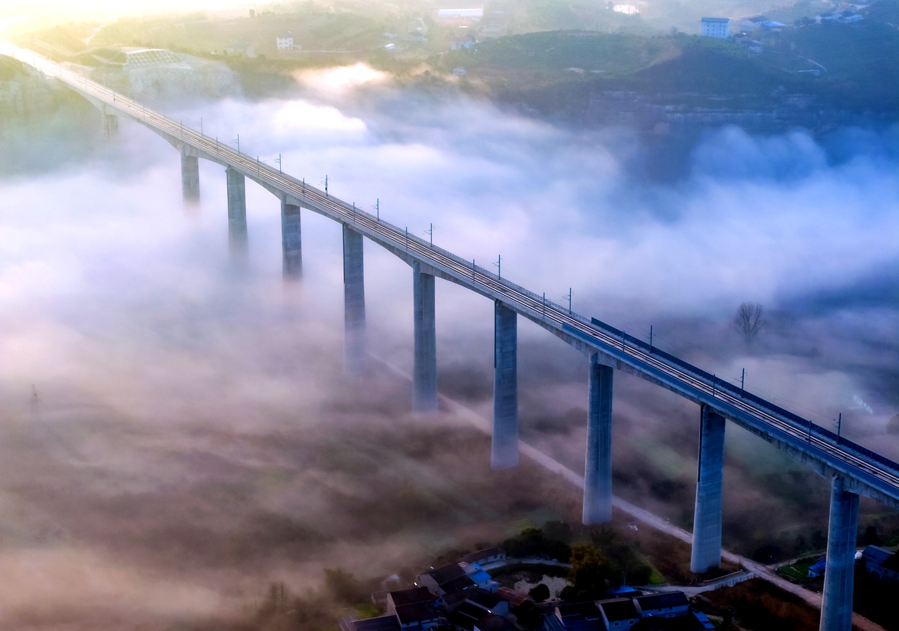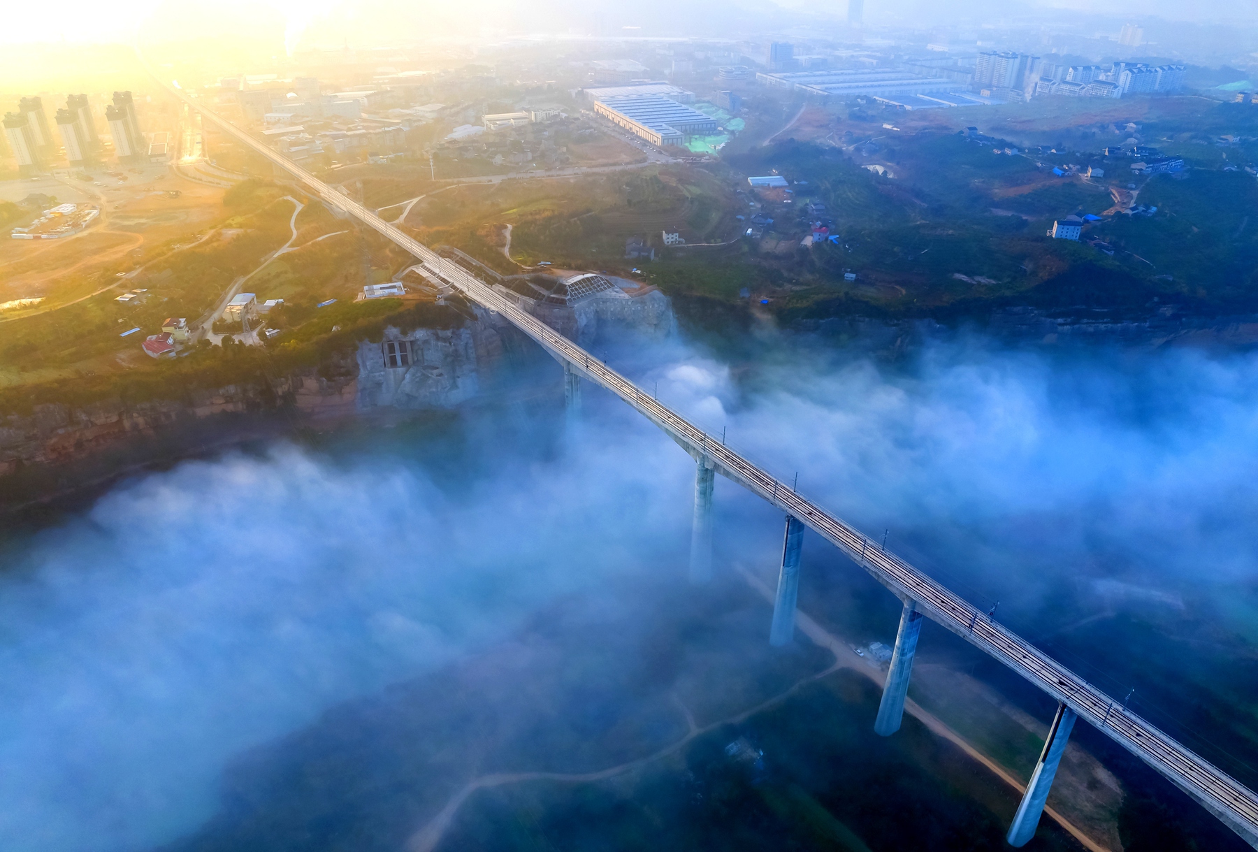 宜昌夷陵:黄柏河现平流雾奇观 高铁大桥穿行如入仙境