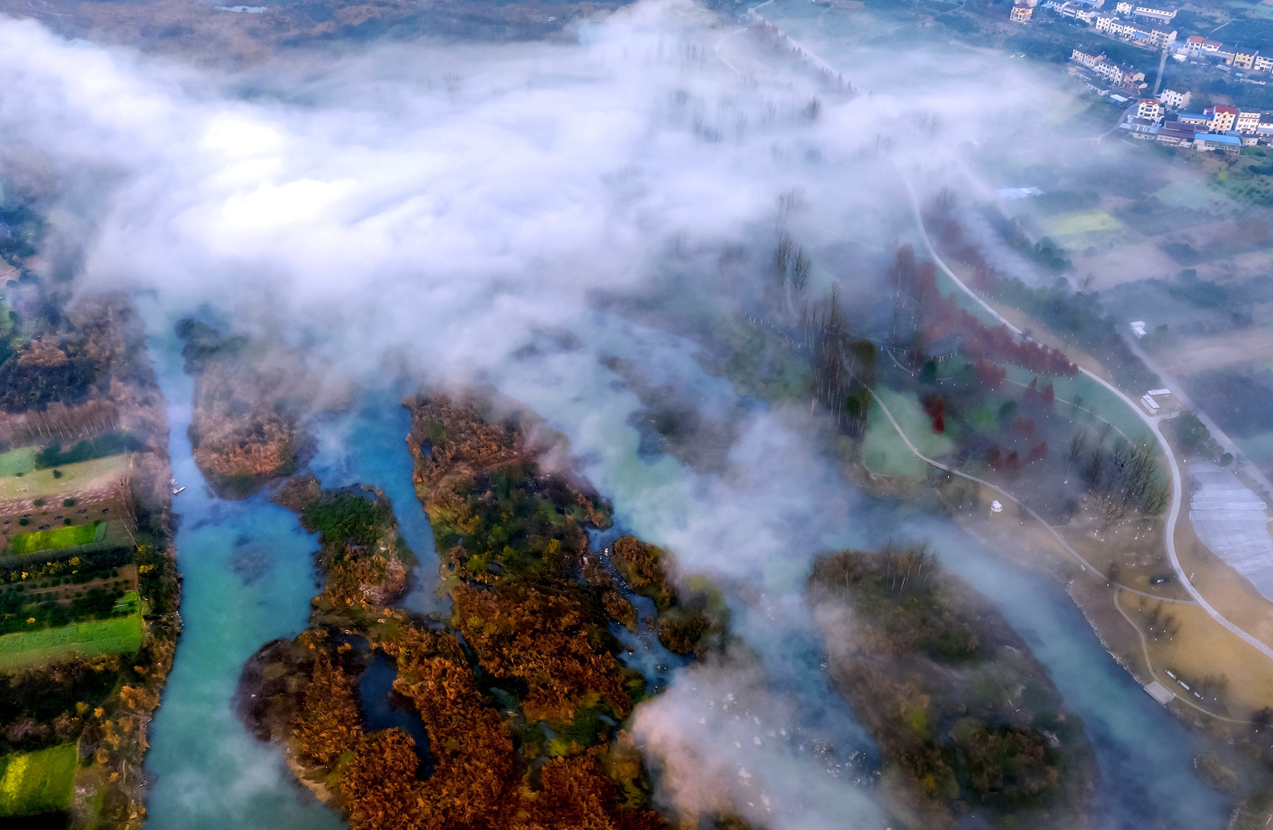 据了解,此次平流雾的形成源于昼夜温差与湿地独特环境,暖湿空气流经寒冷的湿地地表后冷却凝结,在适宜风速作用下绵延铺开。蔡家河沿岸湿地一带雾气最为浓郁,白茫茫的雾霭如轻纱漫舞,随着晨光渐升。雾气时而浓密遮蔽天地,时而消散露出枯黄的草丛与澄澈的水面,秋冬交替的湿地在云雾中更显静谧迷人。