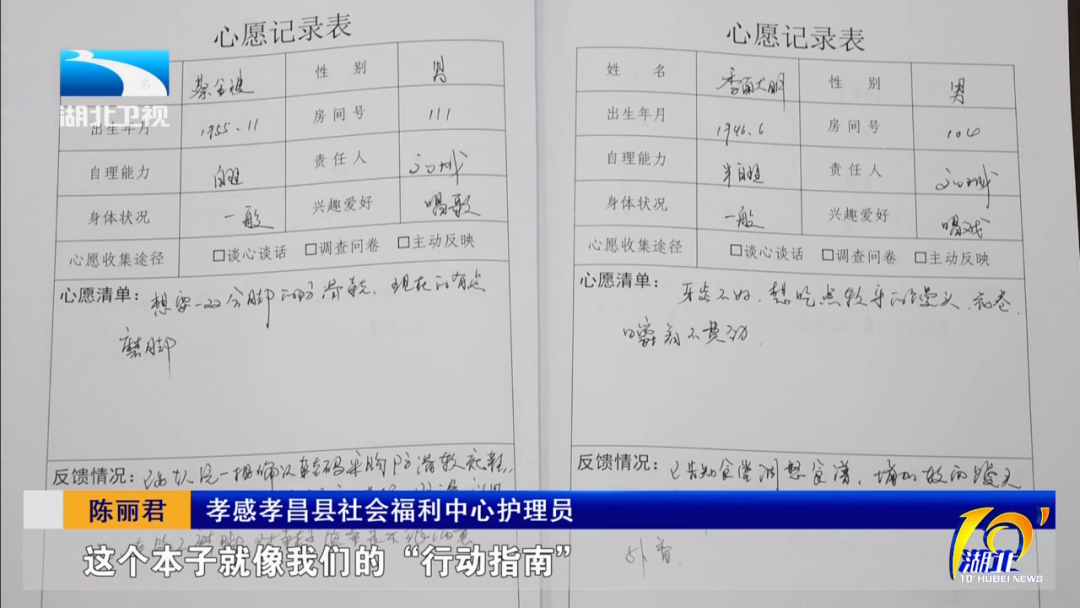 孝昌县社会福利中心护理员 陈丽君:记录了她的心愿之后,我们马上行动,这个本子就像我们的“行动指南”。